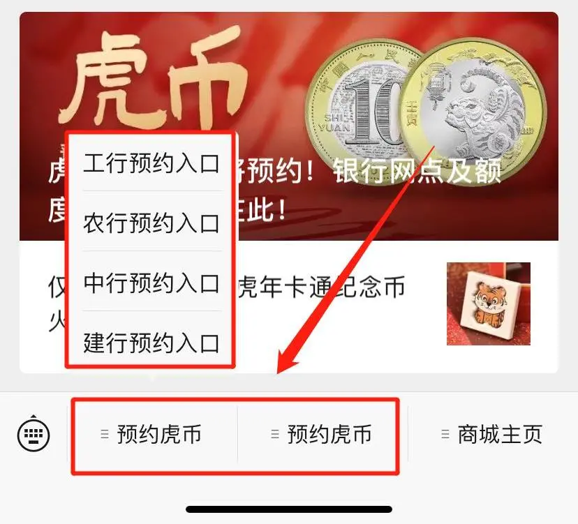 虎年纪念币,可在微信、电脑、APP上进行预约,预约入口如下: