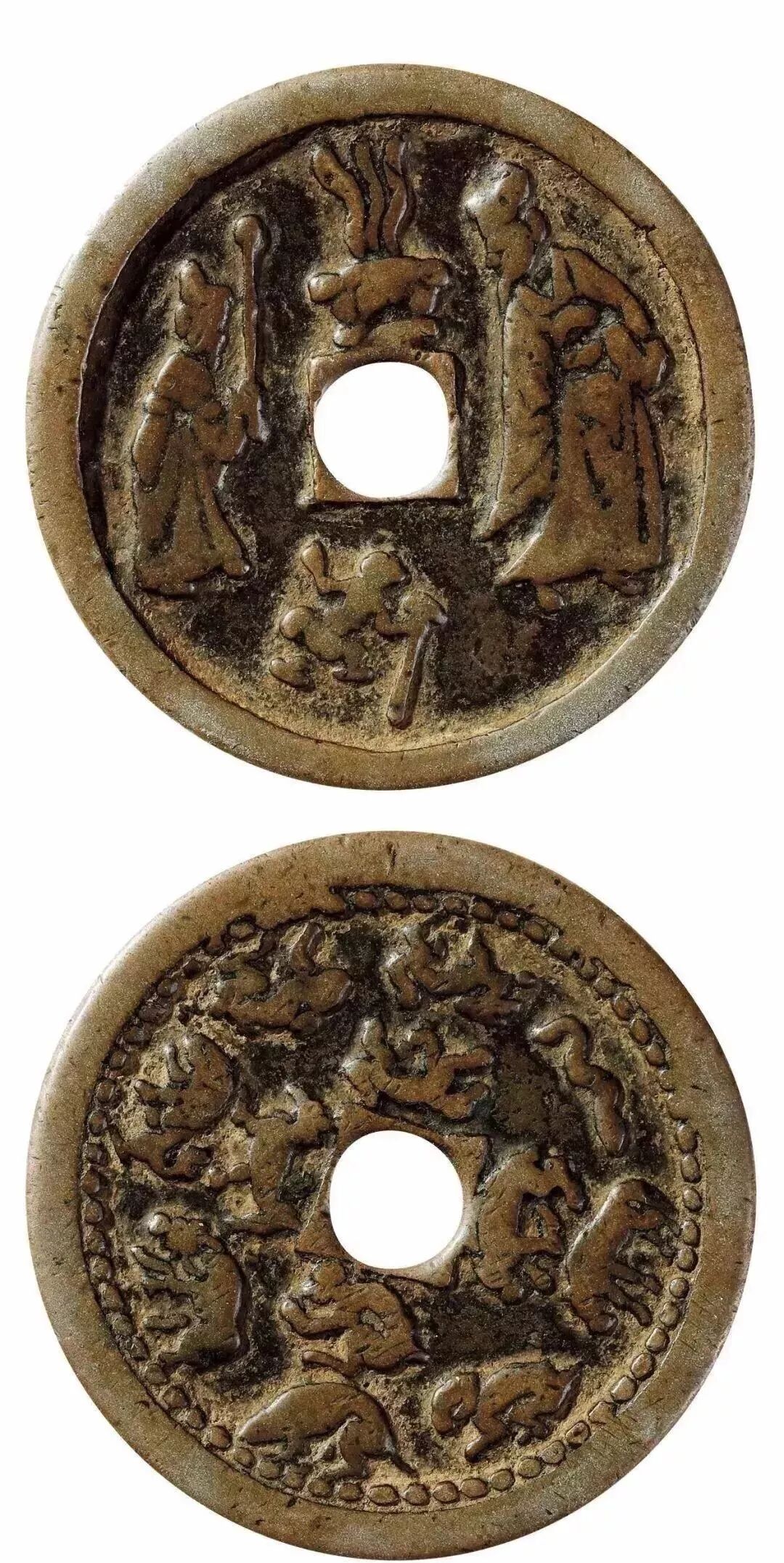 到了宋代,由于真武大帝的传说渐渐流行,此类题材的辟邪花钱也随之大量出现在压胜钱上,以便满足百姓辟邪的愿望。