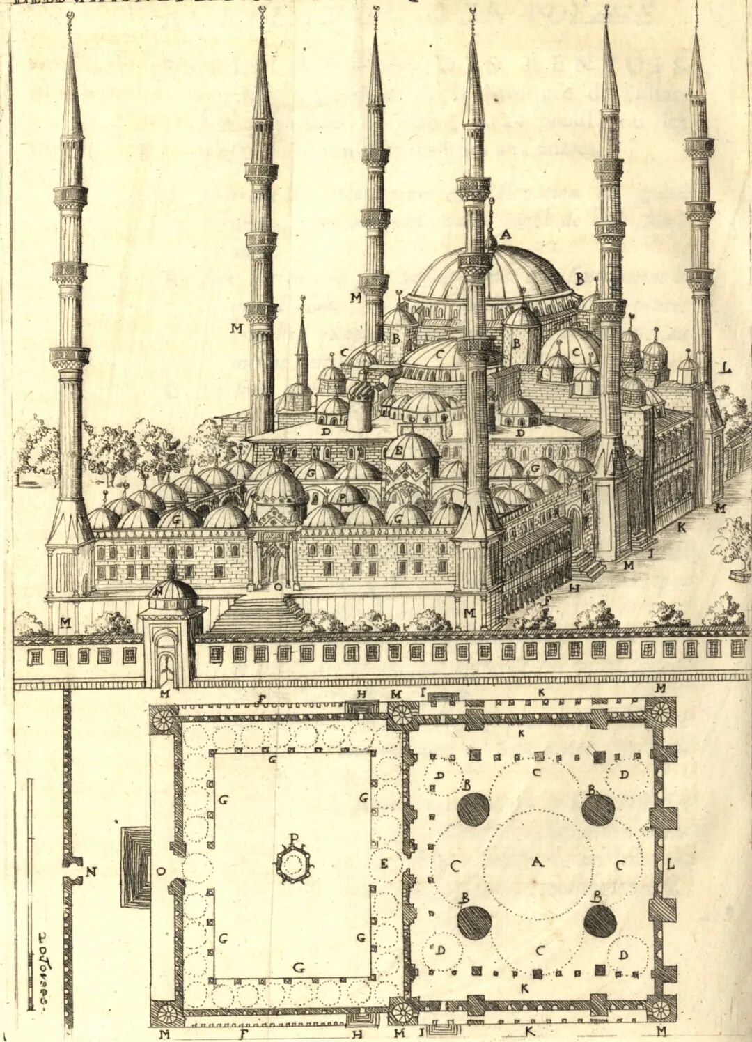 1609年,阿加接受了苏丹艾哈迈德一世的委托,要在伊斯坦布尔仿照圣索菲亚营建一座巨大的清真寺。苏丹艾哈迈德一世在位期间政局不稳,各地叛乱层出不穷,和波斯的战争遭遇惨败,失去了东方大片领土,而在欧洲与奥地利的争夺战中也呈现出颓势,以致于不得不向西欧诸国开放某些商贸优惠条件。![]()