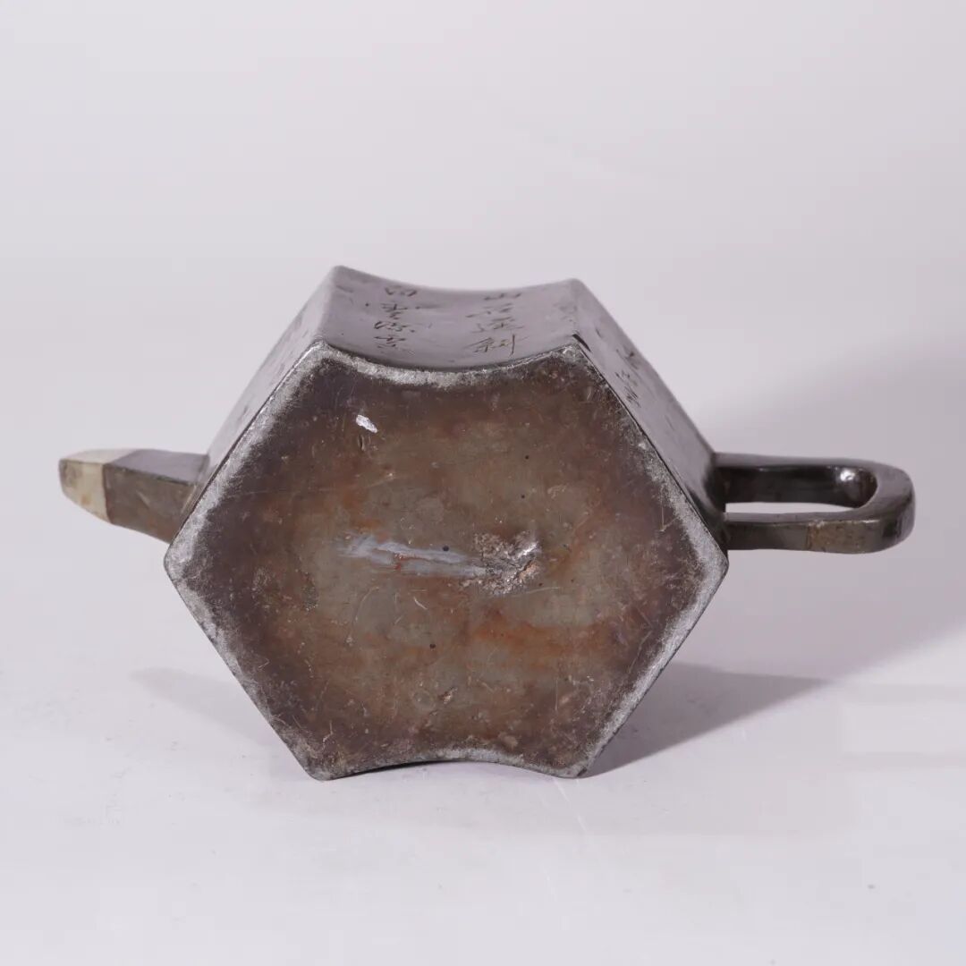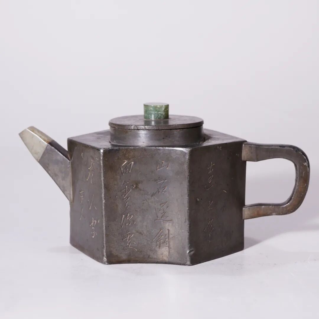 此壶紫泥为胎,包锡为饰,壶体四方微敛,钮盖镶嵌白玉,握把木柄润雅,包浆醇厚自然,更显文人雅趣。壶身錾刻诗文,笔道洒脱写意,意味十足,内底篆落“杨彭年制”款。锡包壶是清代嘉道年间出现的创新工艺门类,常见名家制壶,文人铭刻书画。其制作工艺相当复杂考究,需以紫砂胎包锡、玉料镶嵌等多种工艺相结合,故而制者寥寥,颇为稀有,又因由文人参与制作,成品自然显现文人的个性和审美意趣,较其他紫砂壶品类而言,更显特性风雅。