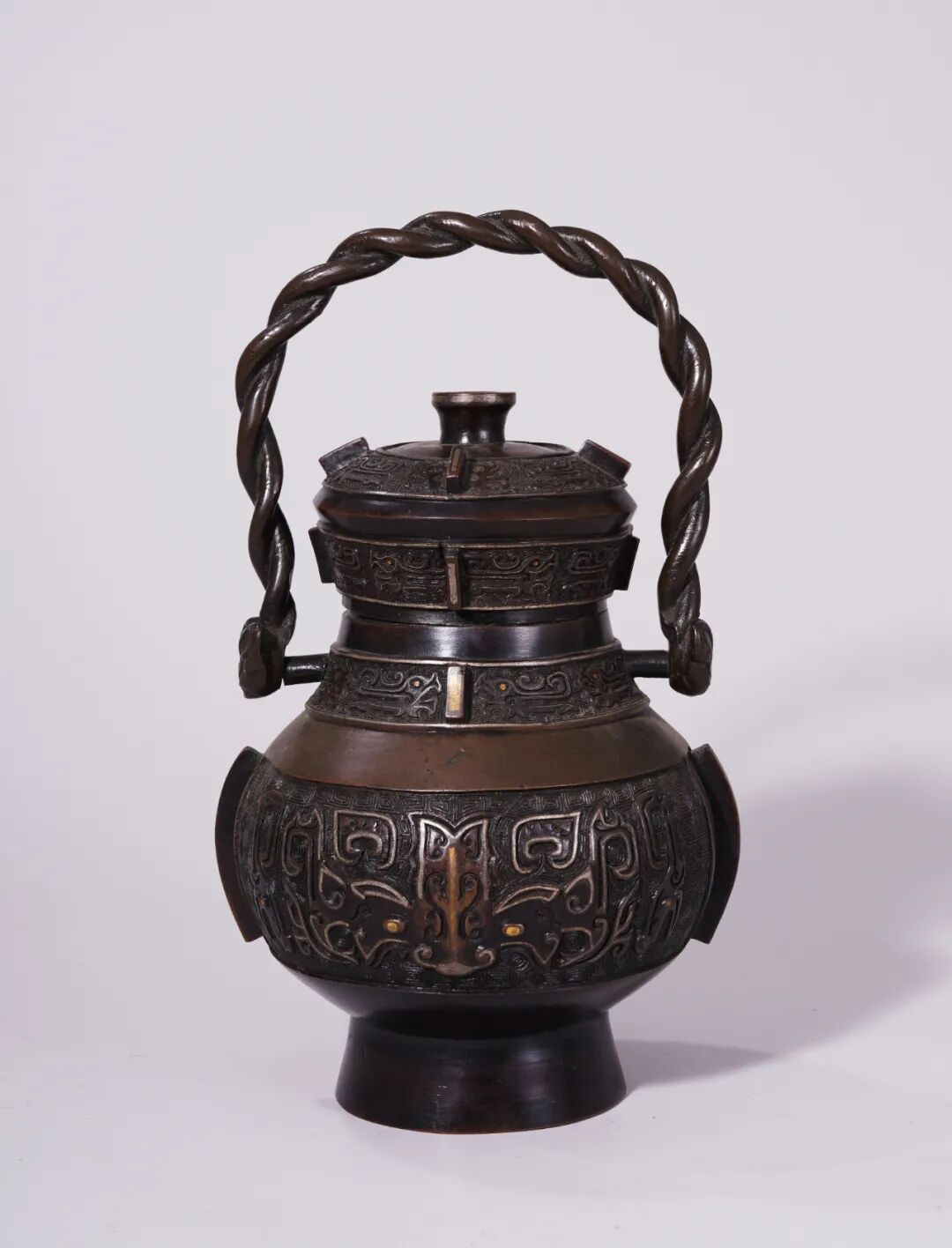 本品为马槽炉,因其形状长方、形似马槽而得此名。炉以精铜所铸,入手沉稳,用料精绝,形制朴雅大方,口唇方折,双耳低垂,四壁皆倾,上阔下狭,器势肃穆庄雅,颇得明宣古韵。器底篆刻私印“鑑湖武公陆氏珍藏”款,字体雅正。我国古代铜炉多采“天圆地方”之意而得其型,其中取“天圆”者甚多,取“地方”者甚少。本炉式俗称马槽,《金玉青烟》谓之“戟耳长方炉”,系由《宣德彝器图谱》之台几炉式衍化而成,取“地方”之象,喻耿直之意,为文人所青睐。此类器物,多为官宦富贵人家定造之物,故有“马槽多私款,私款多佳器”之说。便是其中之佳例。私款铜炉往往精益求精,多为孤品,耗费颇奢,较一般铜炉尤更精绝。此炉底镌私款,质料极佳,色泽古雅,便是其中佳例。