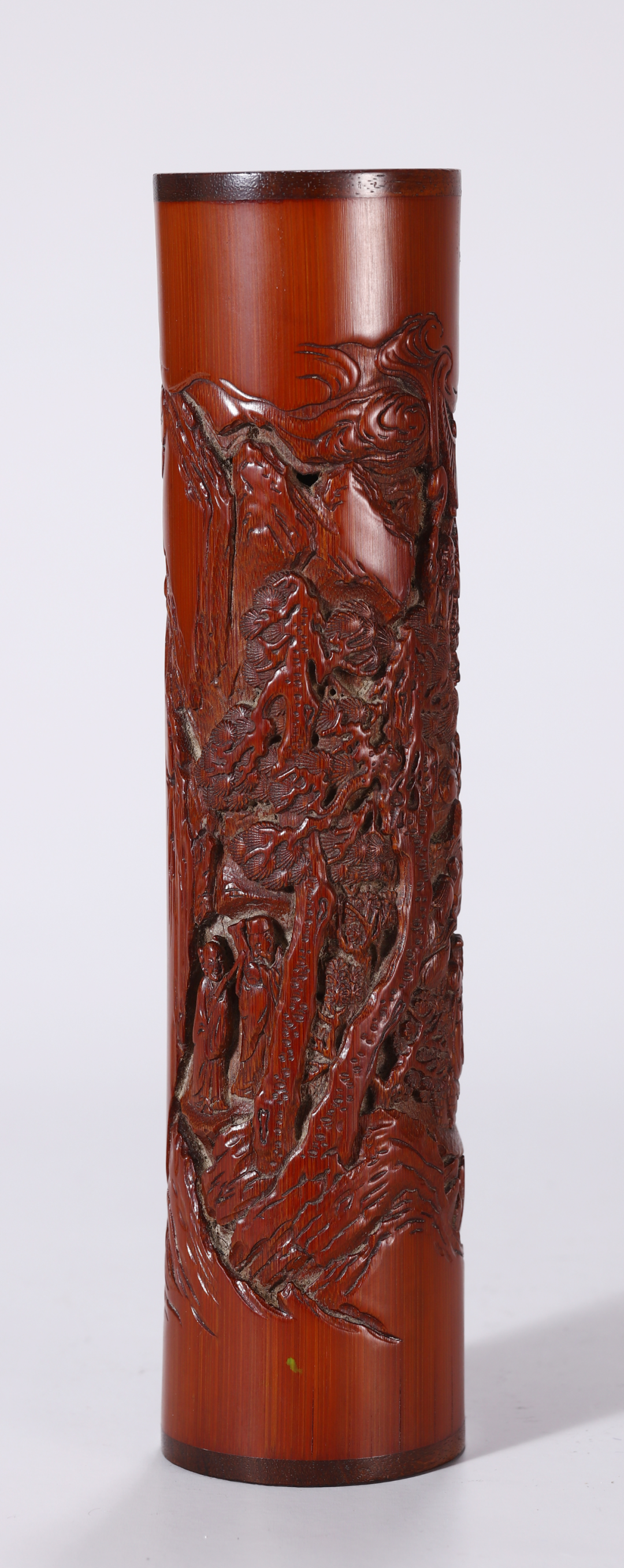 本品为竹木制香筒,筒身通直,竹木质地温润,包浆醇厚,承座扁平。筒身以透雕法饰高士山水筒,雕工贴合竹木纹理,工笔讲究,技法精湛,山石林木间,卷云舒展,亭台隐现,又有高士形于其间,吟诗作赋,结伴赏趣,游戏山水、文雅抒情之意境尽显,清静自然之意蕴悠长。竹雕香筒,又称为“香笼”,是一种燃点直式线香的香具,与插香的小筒有所分别。为了使香气能迅速四溢,故这类香筒大多采用透雕法制作。置此品于文房之中,闲暇静思、吟诗作画之时,可感阵阵清香自玲珑剔透的筒壁溢出,可谓文房佳品,可呈趣味盎然。