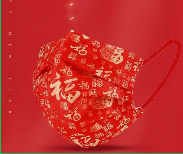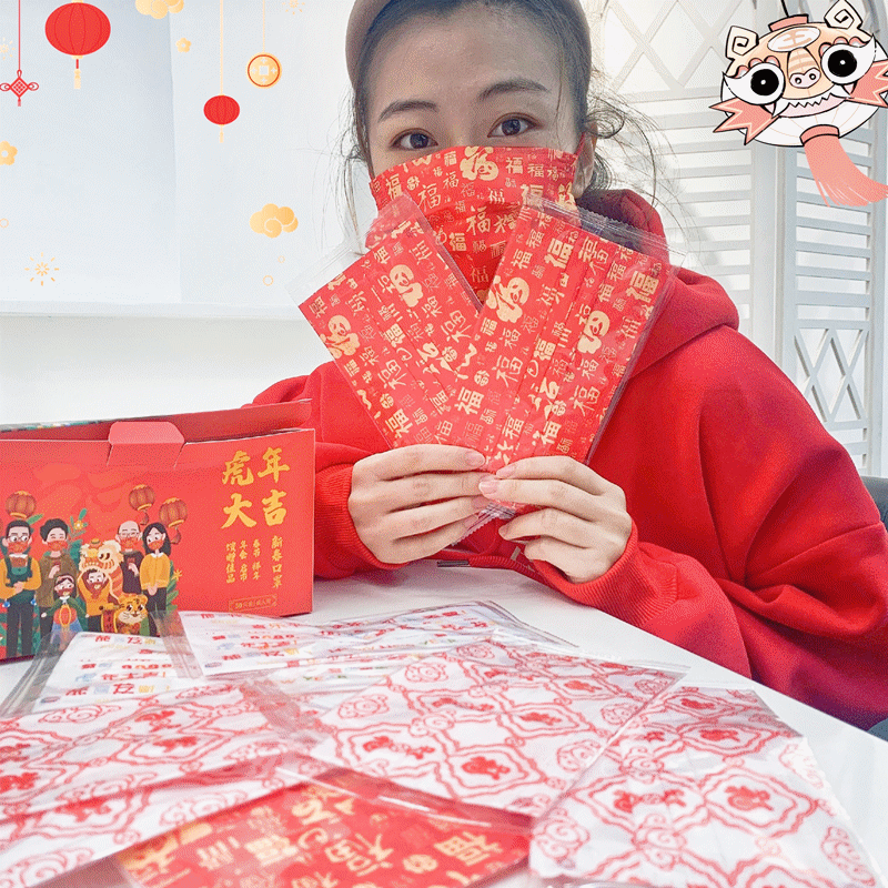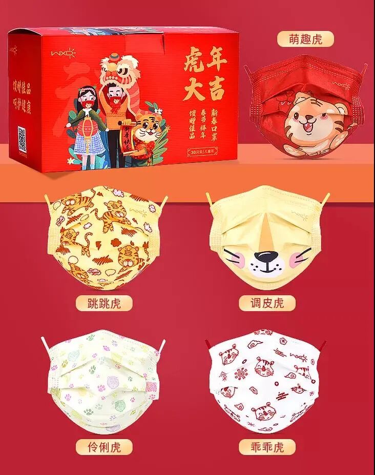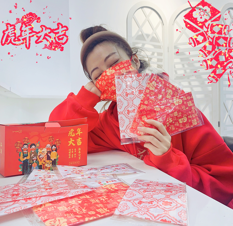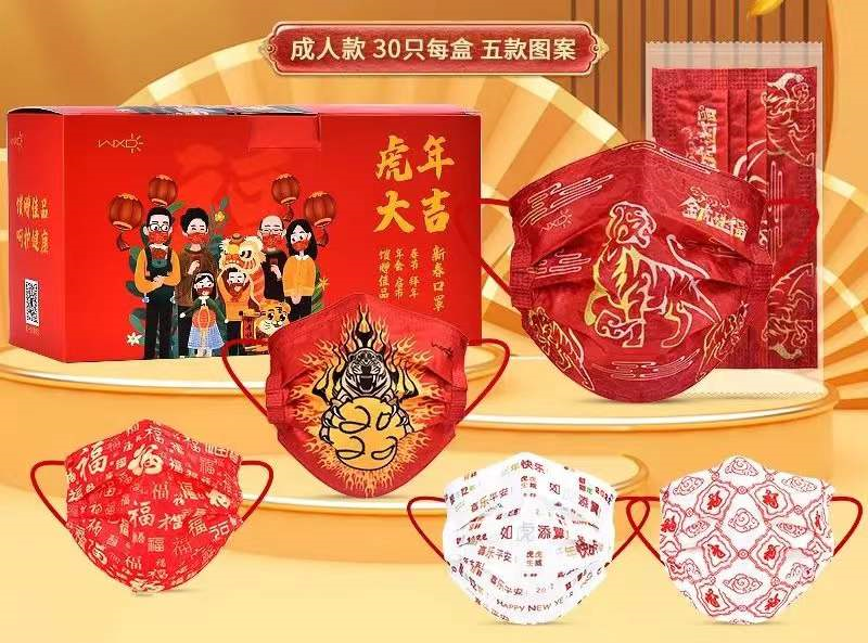 它将中国风新年元素融入工艺当中,创意国潮,以“福”字和“虎”年卡通形象为创意原点,把新年祝福印在口罩上,寓意吉祥如意。