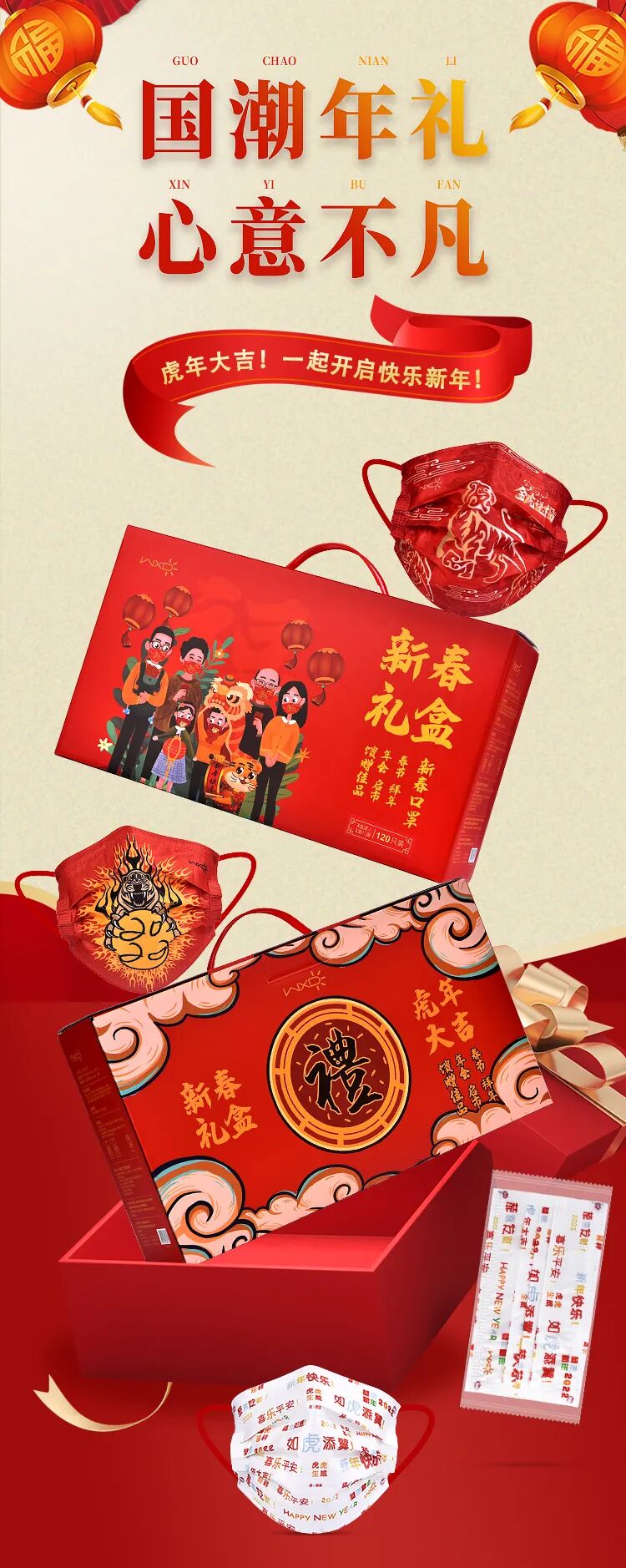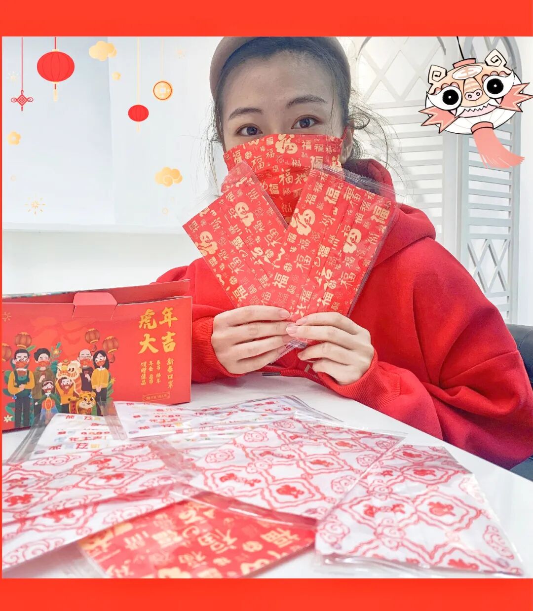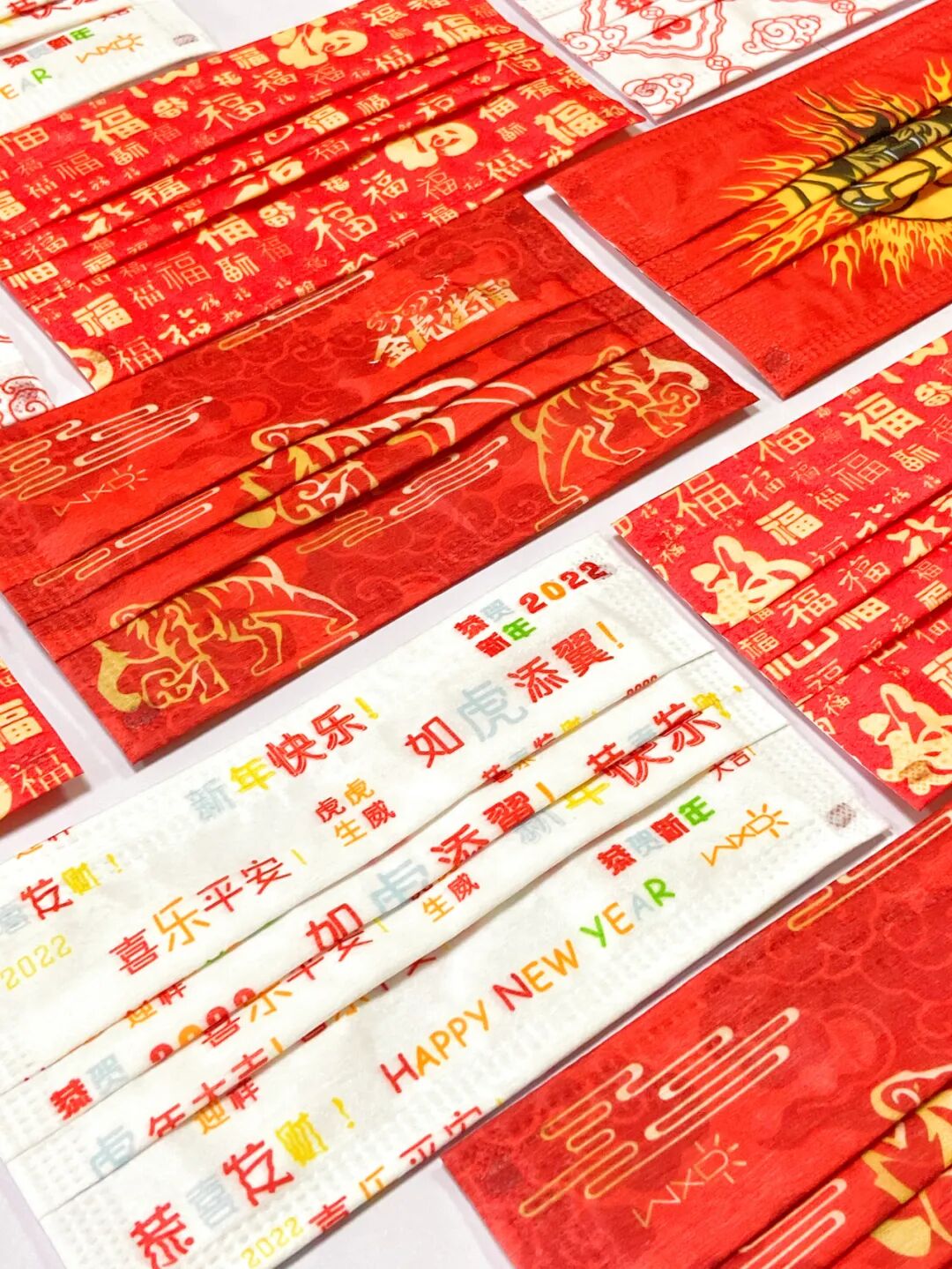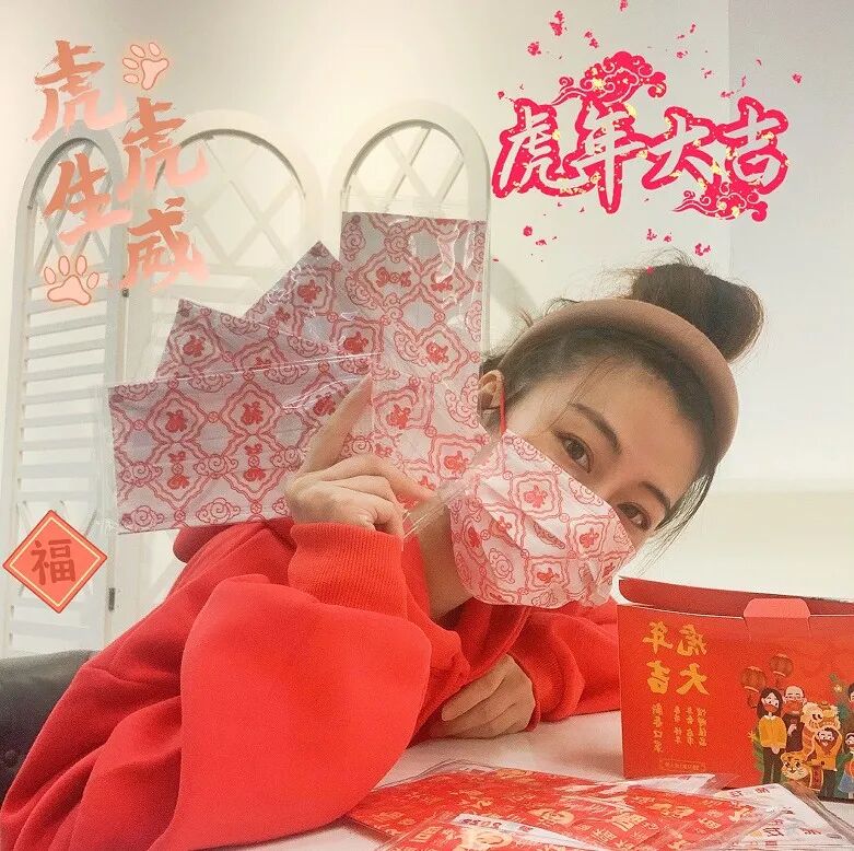 “虎”、“福”、“如虎添翼”、“喜乐平安”的关键字词,国潮创意,结合洋溢着节日氛围的中国红,从口罩到挂耳都是红彤彤的,格外有感觉~