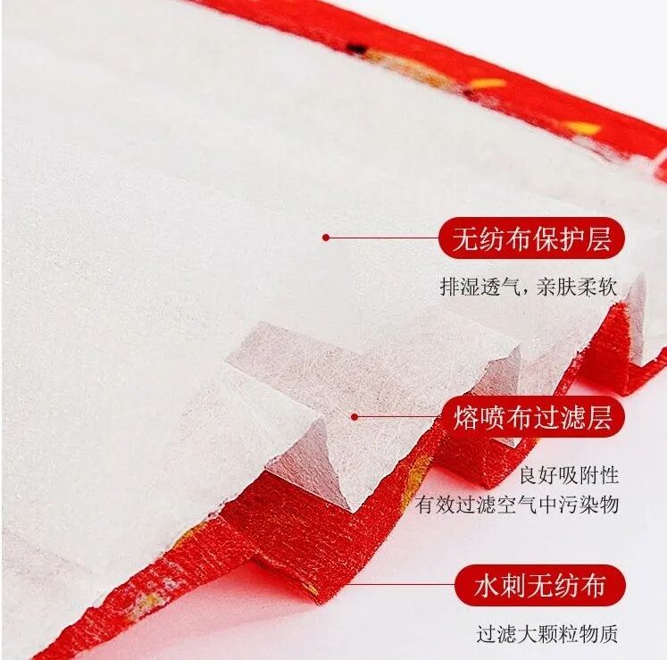 做了3层防护:表层水刺无纺布,中间是熔喷布过滤布,内层是亲肤无纺布,防飞沫、粉尘,满足外出佩戴需要。