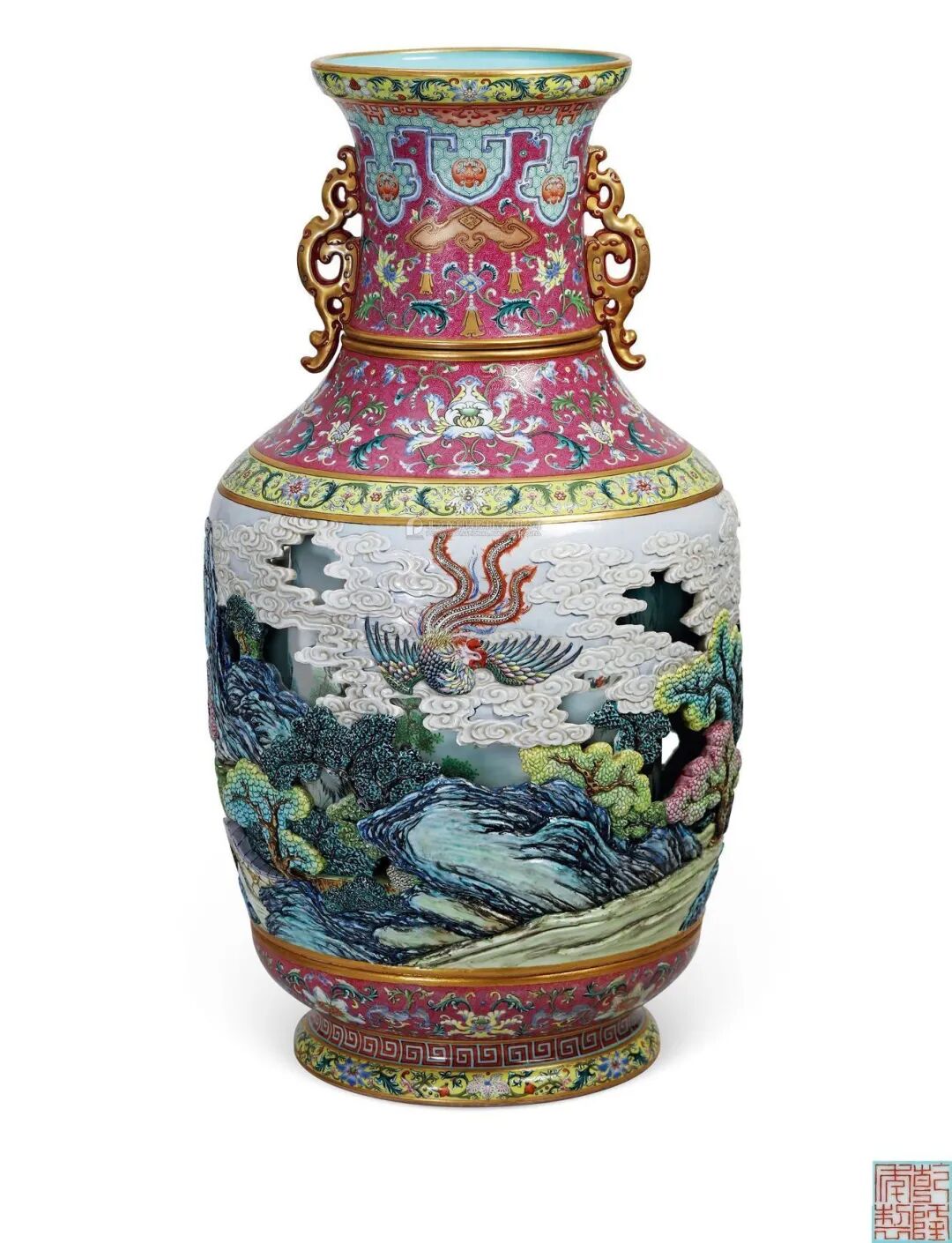 清乾隆 御制洋彩胭脂红地轧道雕瓷