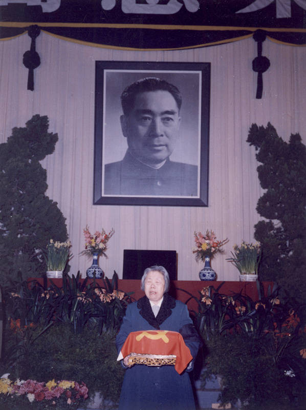 1976年1月14日下午6时,吊唁活动结束。6时30分,邓颖超由赵炜搀扶着走进灵堂,她先带领大家向周总理三鞠躬,然后双手接过骨灰盒,面对众人,她深情地说:“我现在手里捧着周恩来同志的骨灰,向在场的所有同志表示感谢。”话音未落,全场失声痛哭。