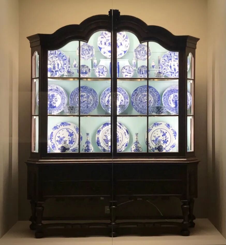 而在本次的展览中,由荷兰的倪汉克先生所捐赠的这件装满中国外销青花瓷的胡桃木橱柜,似乎让我们切实感受到了这股在欧洲装潢领域吹起的中国瓷器风。根据家居装饰的不同,有一些瓷器柜的背板会采用镜面的形式,这样不仅可以强调其所展示的瓷器,还能扩大空间感;有的瓷器柜为了方便展示盘子,会在其搁板上刻有凹槽。再根据器形、大小、纹饰对瓷器进行精心的摆放,无疑是彰显主人眼光与品位的最佳方式。