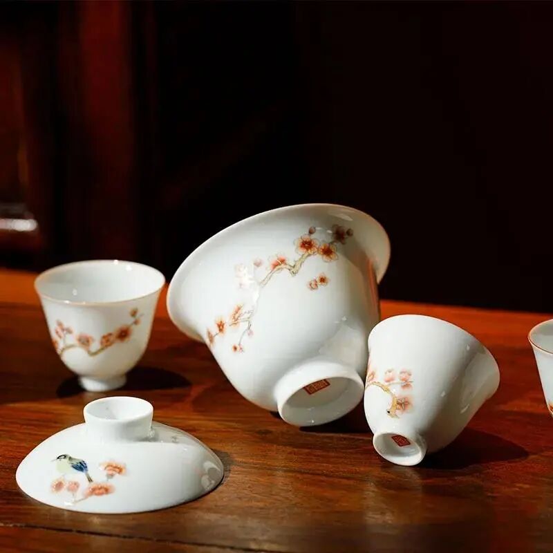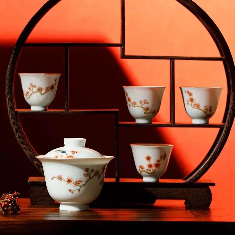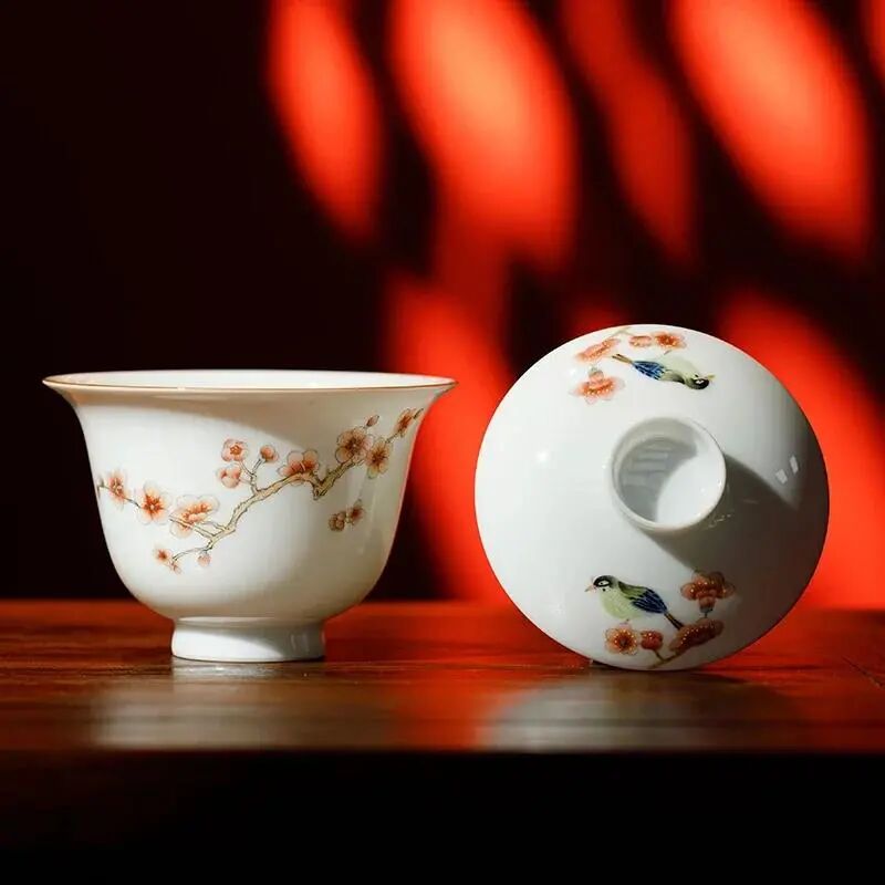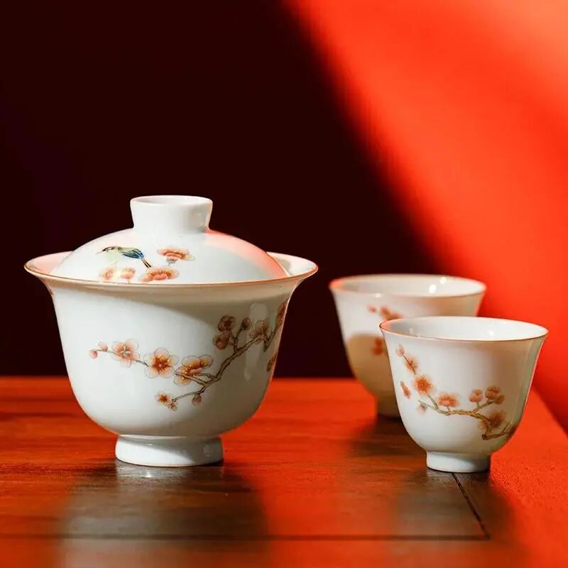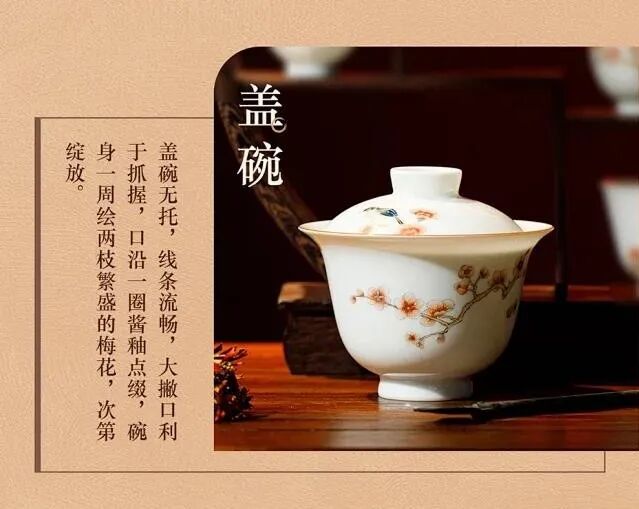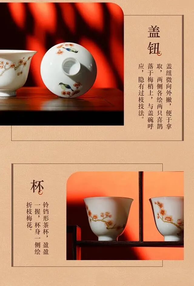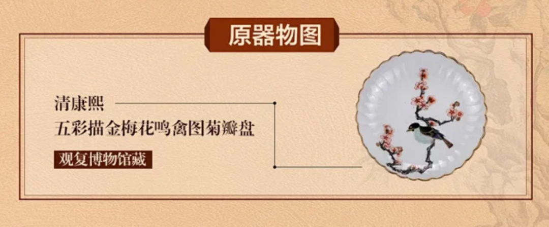 观复文化根据馆藏器物【清康熙 五彩描金梅花鸣禽图菊瓣盘】设计推出了【新彩喜上眉梢盖碗套装】