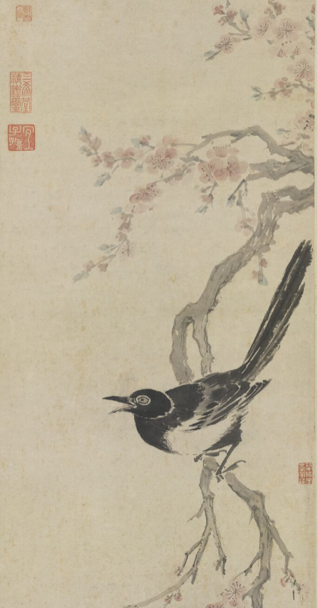 朵朵梅花浓淡有致,高洁清透。喜鹊活泼小巧,恰若在枝桠间跳跃。