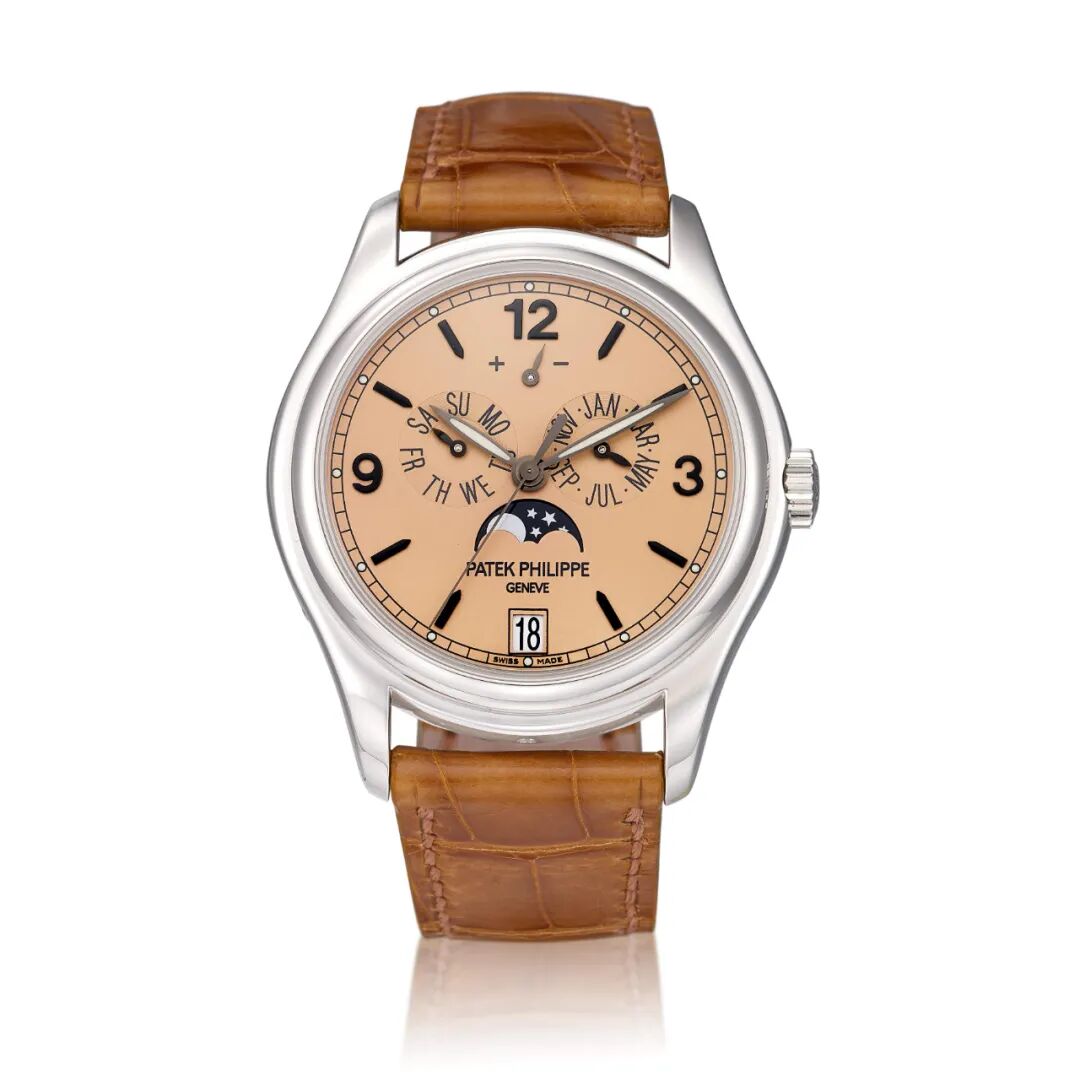 百达翡丽型号5450,铂金年历腕表,备月相及动力储备显示