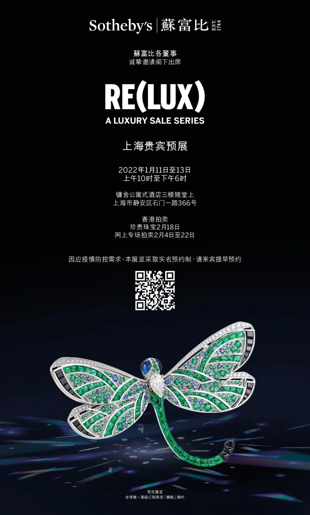 「RE(LUX)」拍卖预展将率先于上海举行,展期为1月11至13日;所有精品将于2月11至17日于香港展出。亮点包括一枚梵克雅宝全球唯一高级订制珠宝「蜻蜓」胸针;一套顶级翡翠首饰;以及当今炙手可热的新星——罕见稀有的亚历山大变色石及「碧玺之王」帕拉伊巴碧玺。
