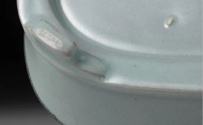 原本属器壁外侧中央处、现为口沿下方的部分,可看见有一铁斑,并有状如陨石坑的凹洞,应是烧造时胎土中的铁成分喷发所致。这些对青瓷来说照理都是缺陷,或许因其釉色以及烧成结果甚佳才得以传世。又或者如周辉《清波杂志》中所记载:“唯供御拣退,方许出卖”(卷五),是在被宫廷退回之后,开放对外贩卖的作品。底部以等间距分布着芝麻状及圆形的支钉痕,中央则是英国东方陶瓷学会(Oriental Ceramic Society)于1960年举办的展览的展出标签(No. 68)。该水仙盆二度于苏富比伦敦的拍卖会上展出,时间分别是1959年3月27日以及1970年2月24日。在1970年的拍卖会上,英国古董商John Sparks Ltd.以4万6000英镑(当时古陶瓷的世界纪录)得标,之后又由安宅产业股份有限公司将本作买下,纳入安宅藏品。