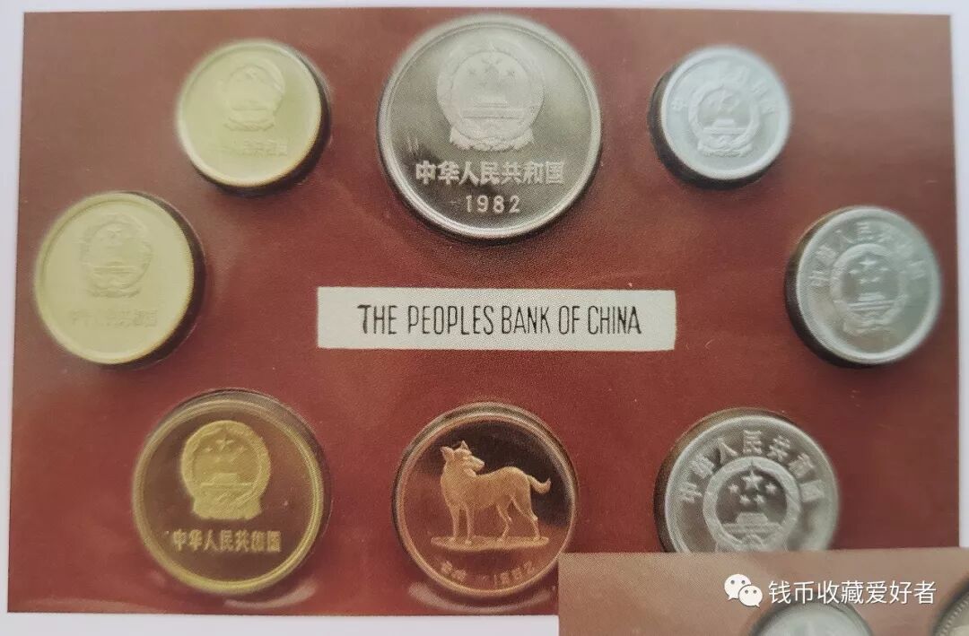 2、套装币:1982年套装流通硬币,含7枚精制币和1枚狗年生肖章,由上海造币厂生产,包装印有英文说明书,参考装帧发行量21538套,珍稀度3颗星。