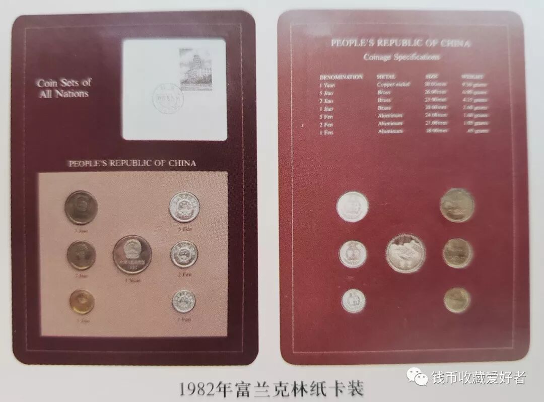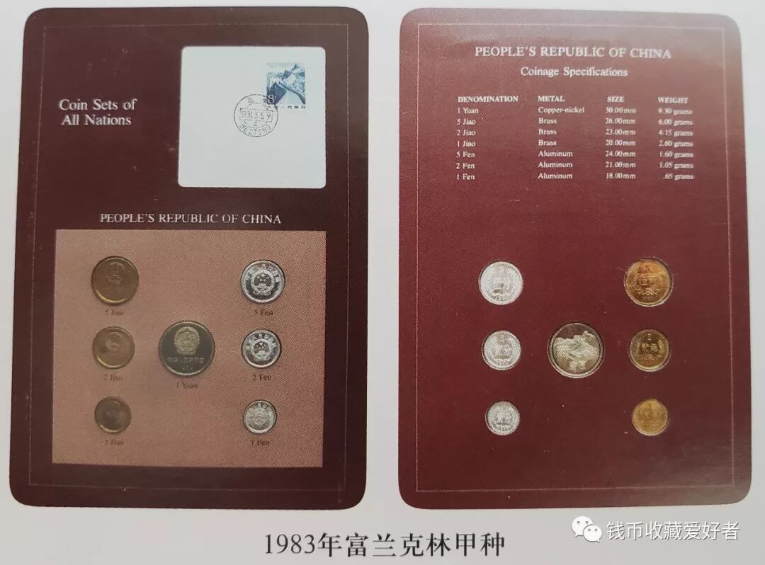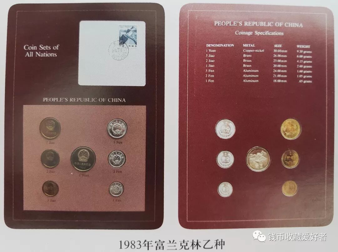 (4)富兰克林卡纸装精制混装币A种:圆角币使用1983年精制币,贰分使用1983年精制币,壹分和伍分使用的是1982年精制币,卡上印有英文说明,粘贴一张面值8分的长城邮票,加盖“1984.3.5北京”邮戳。