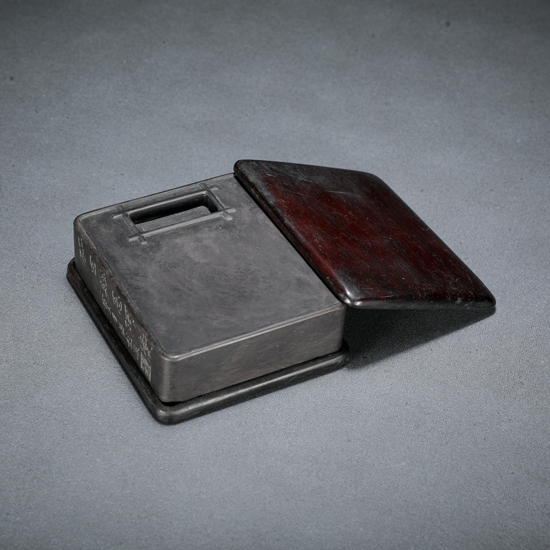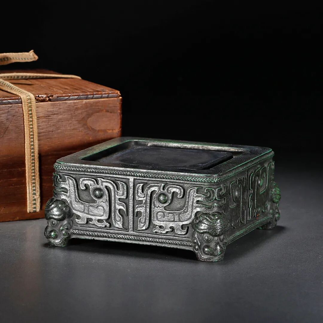说明:此石渠砚以端石所制,四方形,外壁作色,仿青铜绿锈之貌,包浆浑厚自然。砚边沿一周高起,中部砚面平整,沿、面之间打洼一条凹槽,象水渠之形。四壁满工浮雕夔凤纹,每面饰一对背向夔凤,夔凤圆眼钩喙,造型仿商周青铜器纹饰,古韵十足。砚底承四矮兽面纹足,底部作三层台阶式,居中篆书镌刻“宜子孙”三字。外围刻一圈楷书“方盈寸有半,围以渠而周,铜乎石乎泥乎,合一相阅千秋,边幅虽小,其用无穷,如寸田赞化工。乾隆丁酉春御题。”整器厚重端方,工艺谨严,将商周青铜器之古意与清代宫廷器作高超工艺完美结合。石渠砚取石渠阁四方环水的设计,其本为西汉皇家藏书之处,按儒家经典理想化的礼制建造,中心方正、四周环水,与汉代“明堂辟雍”之制类似。石渠砚多见于清代乾隆朝宫廷制器,反映出当时自上而下的摹古之风。拍品原配旧木盒。