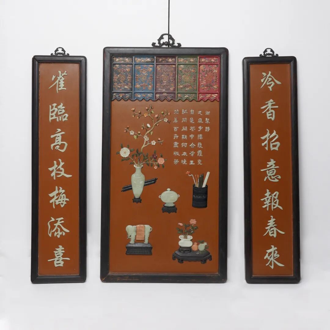 清·漆地嵌宝御题诗挂屏一组三件