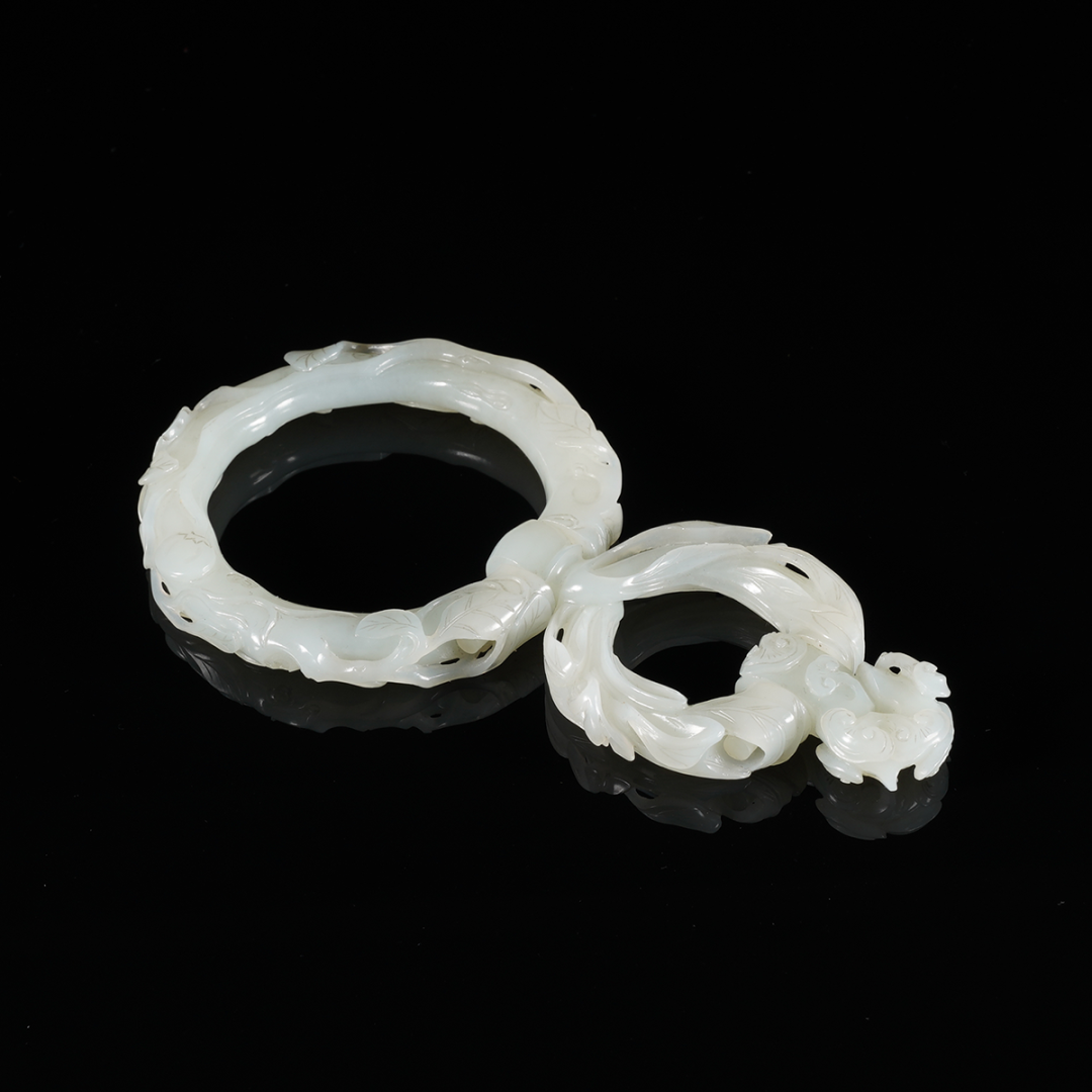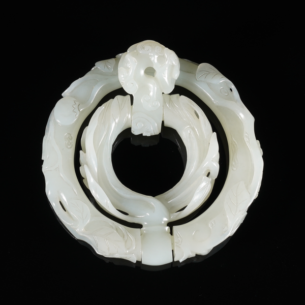 说明:提携,饰用于腰间的配饰,始于唐朝,兴于宋,普及于明清,历代皆有创新与改进。此器取整料雕琢,呈近圆形,玉质白嫩细腻,玲珑剔透,部分掏空取肉制三连活环状,连接玉质薄弱处可见沁,可伸可收,上环提下环,意为提携。世面常见提携皆为两段构造,更难得一见活环套制,与众不同。通视其身,浮雕、透雕、圆雕、内雕众技齐显。