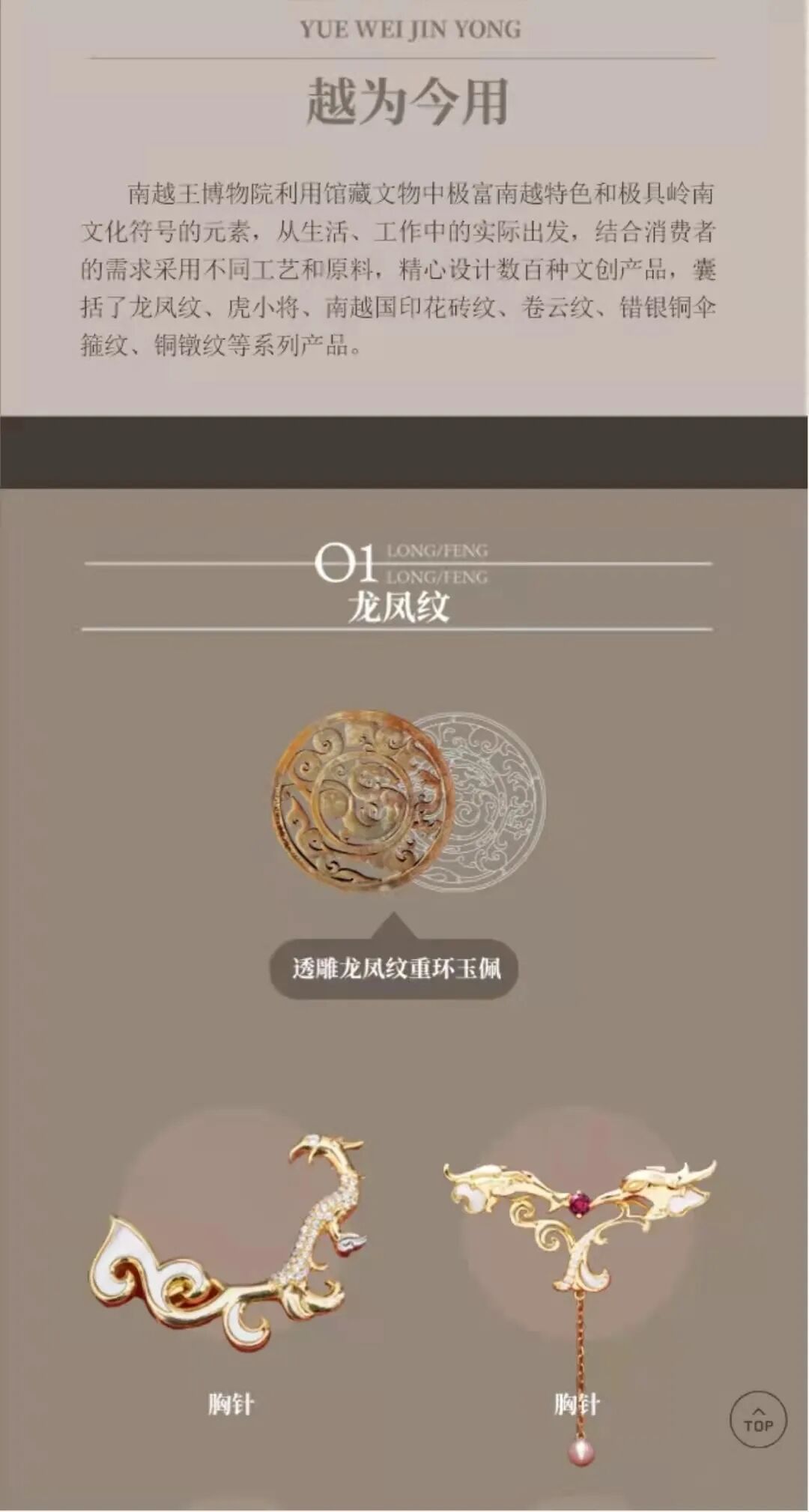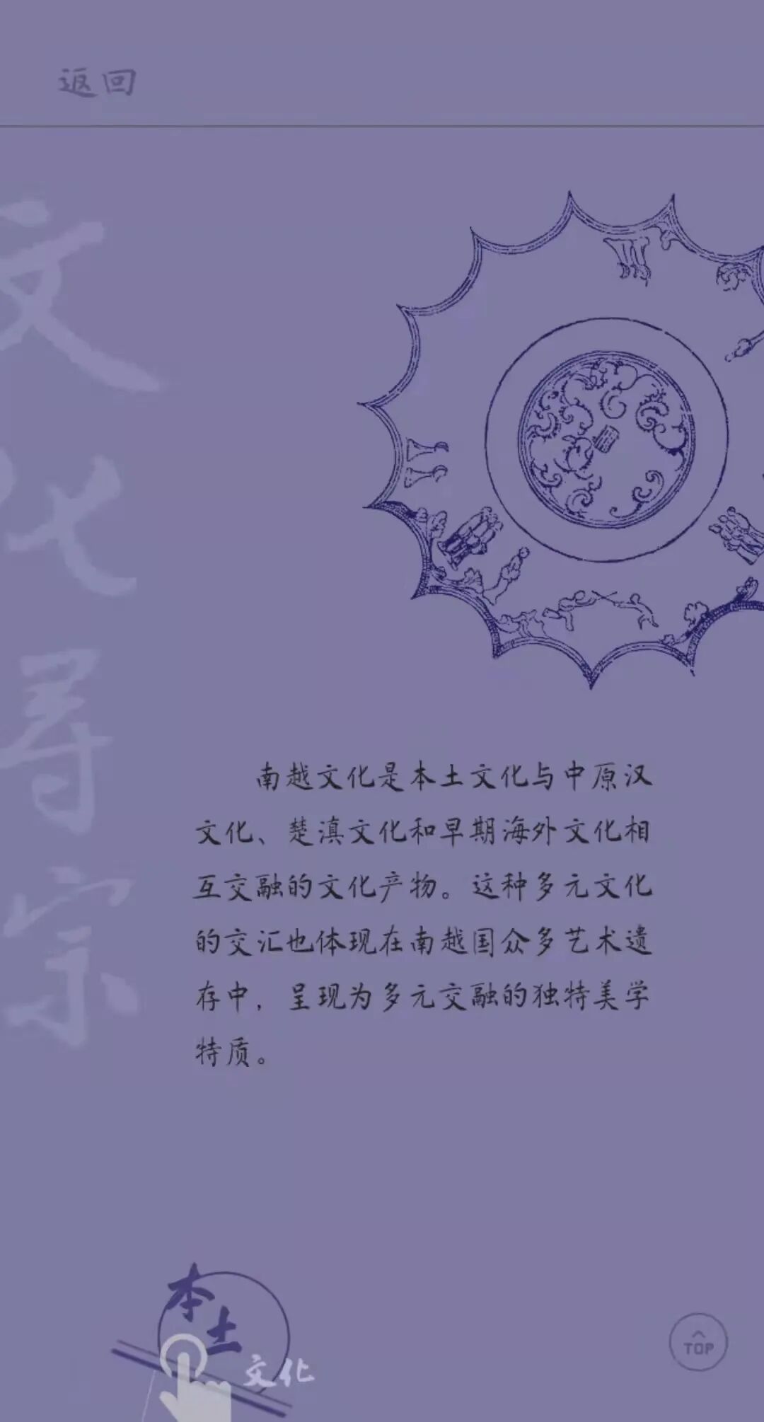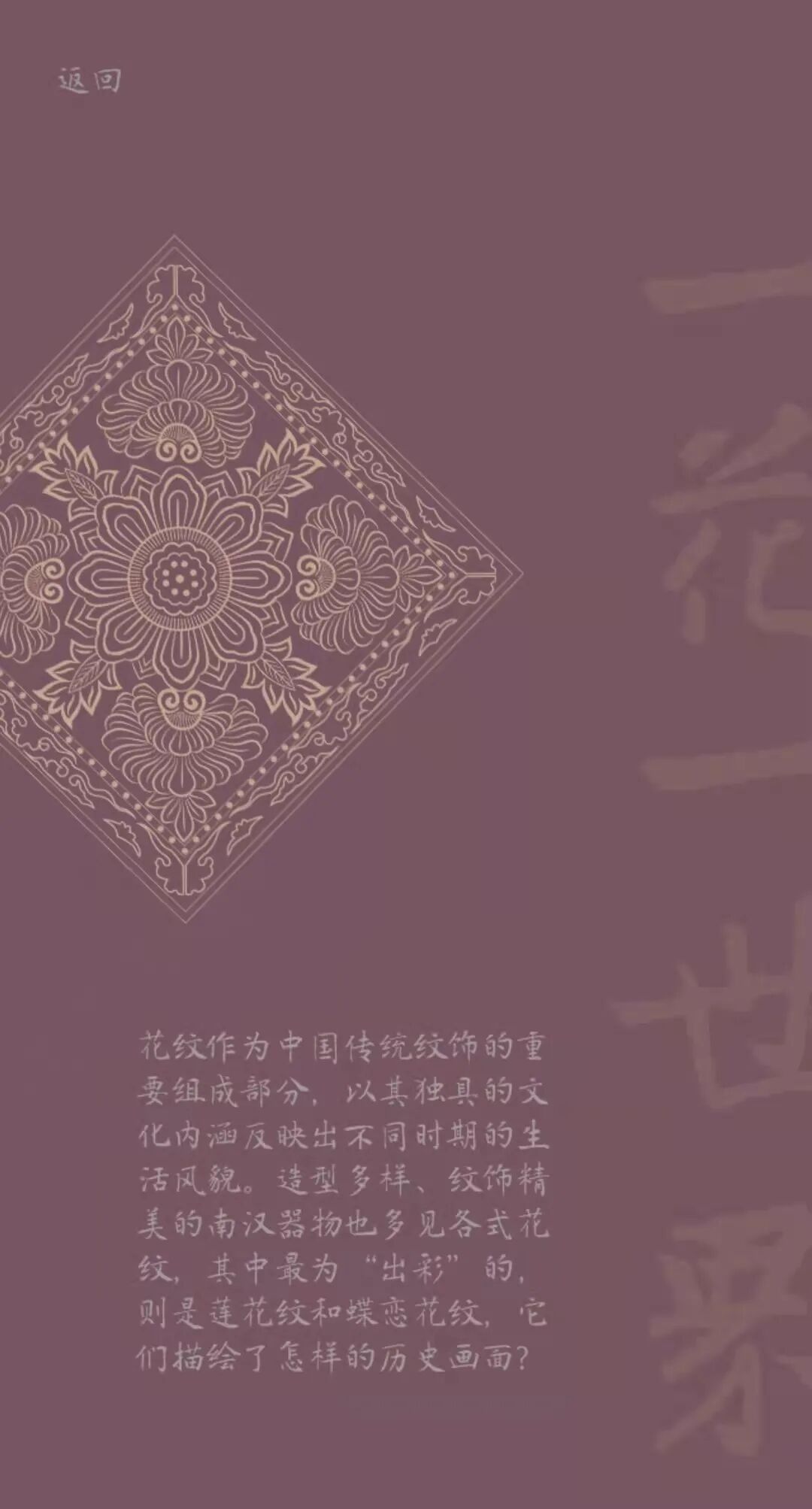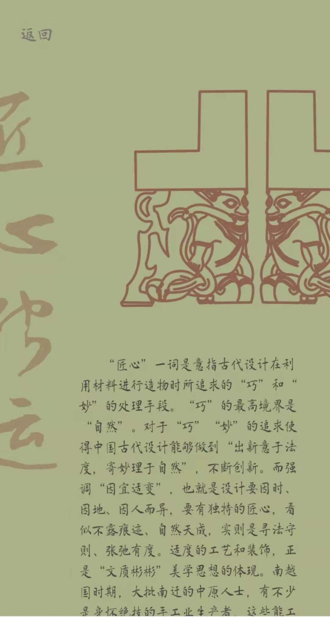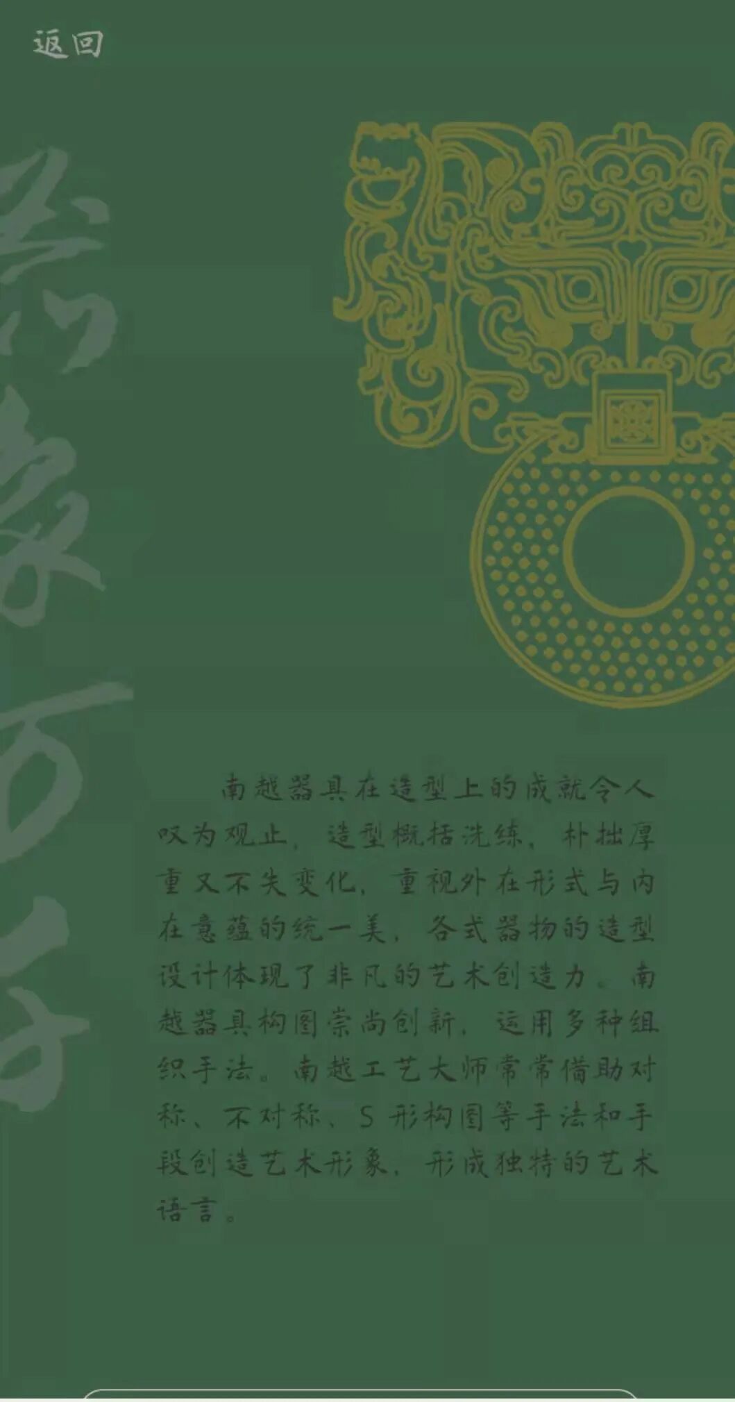 展览跨越千年,汇聚两院南越、南汉时期近300件文物,近100件文创产品,以H5移动客户端为载体,互联网为媒介,通过三维视频等数字化手段打造不落幕展厅,展示岭南地区瑰丽的艺术风貌,展现岭南文化中心地广州在大一统视野下一脉相承的艺术时尚之美,以便观众随时随地漫步云端,品赏文物千秋。展览以酷爱去北京路步行街一带寻觅创造源泉的现代设计师美美的视觉呈现,第一单元南越风华从南越器物造型、纹饰、工艺及背后的文化内涵等角度多维解读南越遗珍,第二单元南汉之绮从南汉瓦当、琉璃等专项类别及文物背后的故事展现南汉文物珍品,第三单元美美相传聚焦南越、南汉文物元素在现代设计中的应用,从而探索文物视觉符号的语义表达与现代艺术设计表现手法的相通之处,总结提炼岭南传统文化的本质内涵,激活传统文化生命力,助力推动中华优秀传统文化创造性转化、创新性发展,以更加深沉的文化自信凝聚起民族复兴的精神伟力。本次展览充分发挥线上展展示手段多样的优势,从与观众息息相关的设计美学的角度展示文物之美,全方位多维度展示历史画卷,希望观众对于文物展览常看常新。 在展陈设计方面,重点突出数字文物的视觉美感,将展览内容隐匿于便捷的交互操作中,结合展示主题,组合展示文物线图、细部图、全局图,让文物的展示特色更加突出。同时通过不同色系的背景布局,营造旖旎的观展氛围。在展品信息的呈现上突破实体展厅文字说明牌的限制,在传递文物基本信息的基础上,综合利用新媒体技术,以丰富的文字、多角度图片、讲解音频、三维展示视频、文物动画片等多种形式对文物进行深入解读,让观众轻松捕捉展品多维信息。在展览互动体验上则设“美美足迹”及“游戏专区”引导观众互动。美美足迹涉及博物院介绍音像视频、三维展示视频、动画片及知识拓展等内容,引导观众交互体验。游戏专区则通过“电子盖章”“瓦当对对碰”“琉璃分一分”“汉服换装”等互动趣味游戏让观众“玩中学”,“学中玩”。