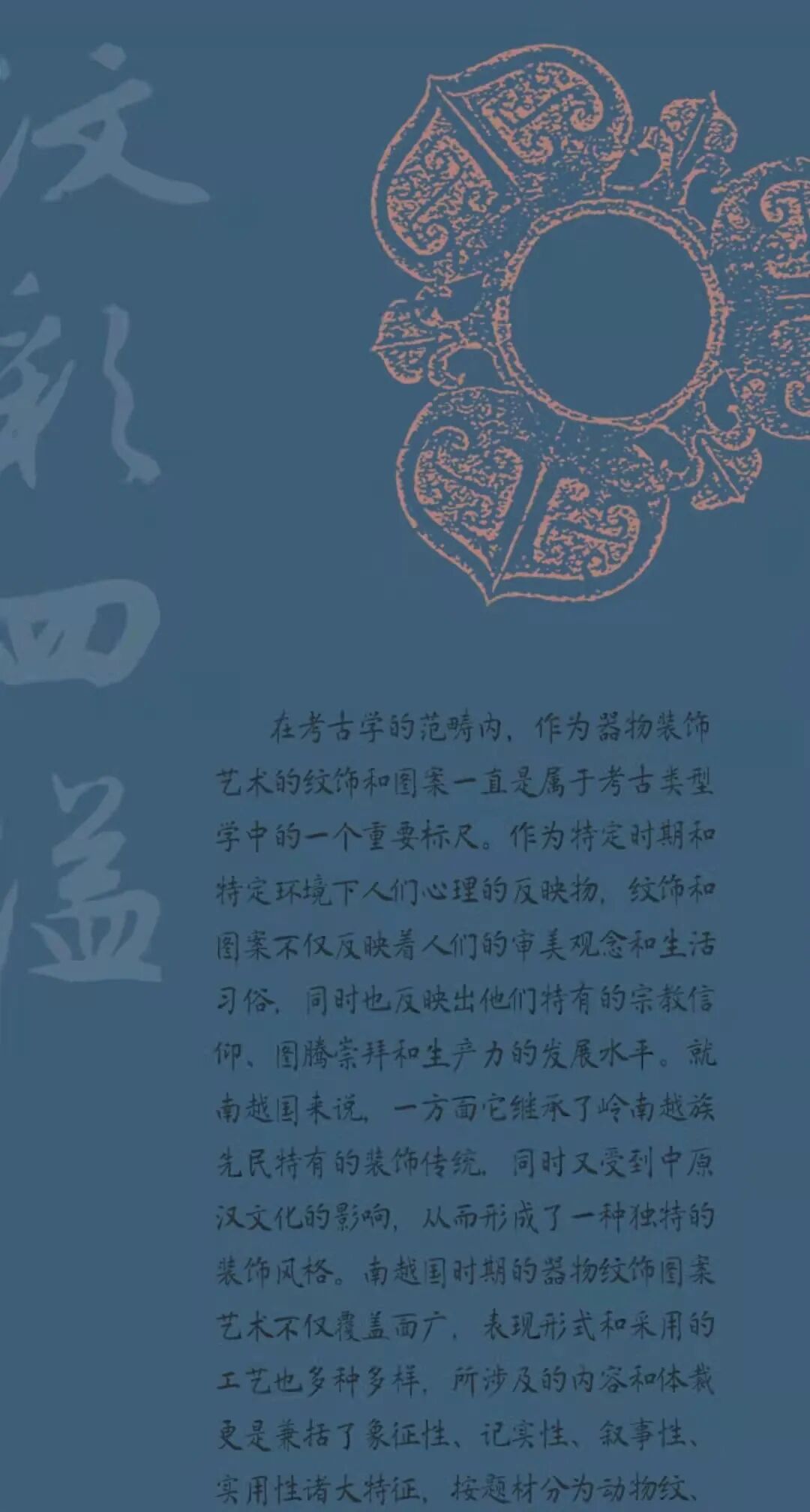 广州作为国际型大都市,一直以“敢为天下先”的气概引领潮流,其中心地北京路步行街既是各种时尚品牌前沿地,又是千年古道、历史遗迹聚集地。北京路头端的南越国(南汉国)宫署遗址既是2000年前西汉南越国和1000年前五代南汉国的王宫所在地,也是历代郡县、州府的治地,是广州延续2000多年不变的城市中心。这一区域虽历经两千多年的沧桑,但其中心地位始终没有改变。这一奇特现象,不仅创造了国内外城市建设中罕见的历史景观,同时也造就了这块神奇的土地灿烂无比的历史文化。伴随广州考古丰硕成果,南越、南汉考古遗址相近发现,南越、南汉文明面纱日趋清晰。南越国与南汉国均以广州为统治中心,以广东省、广西省为主要统治区域,均在帝国改朝换代,天下大乱之际,营造了一方安定的社会局面,为随后融于帝国大统奠定了扎实的物质文化基础。南越、南汉考古遗迹出土文物内涵丰富,造型奇特,纹饰多样,其视觉符号的语义表达方式与现代艺术设计的表现手法有着很多共通的地方。先秦至两汉是我国设计美学形成的基础阶段,许多设计美学观念在这时开始形成,具有中国特色的传统设计也逐渐形成。在这个时期,设计作品的样式逐渐丰富、风格逐渐多样。南越器物设计一方面继承了岭南越族先民特有的风格,同时又广受中原汉文化的影响,从而形成自身独特的设计风格。南越器具在造型上的成就令人叹为观止,各式器物的造型设计体现了非凡的艺术创造力。南越器具构图崇尚创新,组织手法多样,工匠常常借助统一、对称、不对称、S形构图等手法和手段创造艺术形象,形成独具的特殊的艺术语言。南越国一方面它继承了岭南越族先民特有的装饰传统,同时又受到中原汉文化的影响,从而形成了一种独特的装饰风格。南越国时期的器物纹饰图案艺术不仅覆盖面广,表现形式和采用的工艺多种多样,所涉及的内容按题材划分,分为动物纹、植物纹、几何纹、天象纹、人事活动纹和文字纹六大类。南越国时期,大批南迁的中原人士,有不少是身怀绝技的手工业生产者,这些能工巧匠大显身手,使南越国的手工业如冶铸业、玉石业等行业都获得了突破性的发展。南越文化是本土文化与中原汉文化、楚滇文化和早期海外文化相互交融的文化产物。这种多元文化的交汇也体现在南越国众多艺术遗存中,呈现为多元交融的独特美学特质。五代十国时期,中国传统文化重心逐渐转移到南方,形成了若干区域文化中心。南汉社会稳定,经济发展,南汉君主注意吸收中原地区的优秀文化,一时之间,岭南之地人才聚集,在此条件下,南汉的艺术文化建设也取得了一些可喜的成果。南汉统治者在广州建有多处苑圃和宫殿,已发掘的建筑遗址出土了大量的板瓦、筒瓦、滴水、瓦当、兽面瓦等建筑材料和构件。这些建筑构件时代特征明显,规格极高,造型丰富,是研究南汉建筑艺术的重要实物资料。广州市区及近郊出土的有关南汉的遗存十分丰富,其中就有大量精美的建筑琉璃和少量琉璃器具,色彩绚丽,呈朦胧之美,艺术水平很高。造型多样、纹饰精美的南汉器物多见各式花纹,而其中最为“出彩”的,则是莲花纹和牡丹纹。莲花纹是南汉崇尚佛教的体现,牡丹图案则是南汉国文化延续大唐遗风的明证,也是南汉国华丽身影的投射。文物是文化的图谱,也是历史的镜像。每一件文物都在诉说不同的故事。从南汉现有出土文物窥探南汉诗意生活,窑业制造和海上贸易的发展状况。传统艺术设计元素是我们取之不竭用之不尽的设计源泉。现代高度发展的信息化社会给传统造型艺术带来更多的发展契机,新技术新材料的出现也为传统造型在现代平面设计中的重构提供了更多的可能性。南越王博物院利用馆藏文物中极富南越特色和极具岭南文化符号的元素,从生活、工作中的实际出发,结合消费者的需求采用不同工艺和原料,精心设计数百种文创产品,囊括了龙凤纹、错金铭文铜虎节纹、南越国印花砖纹、卷云纹、错银铜伞箍纹、铜镦纹等系列产品。南汉特色和极具岭南文化符号的元素则是南越王博物院和广州市文物考古研究院在博物院文创设计经常用到的元素。