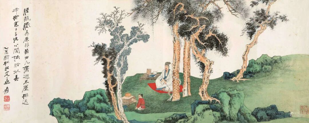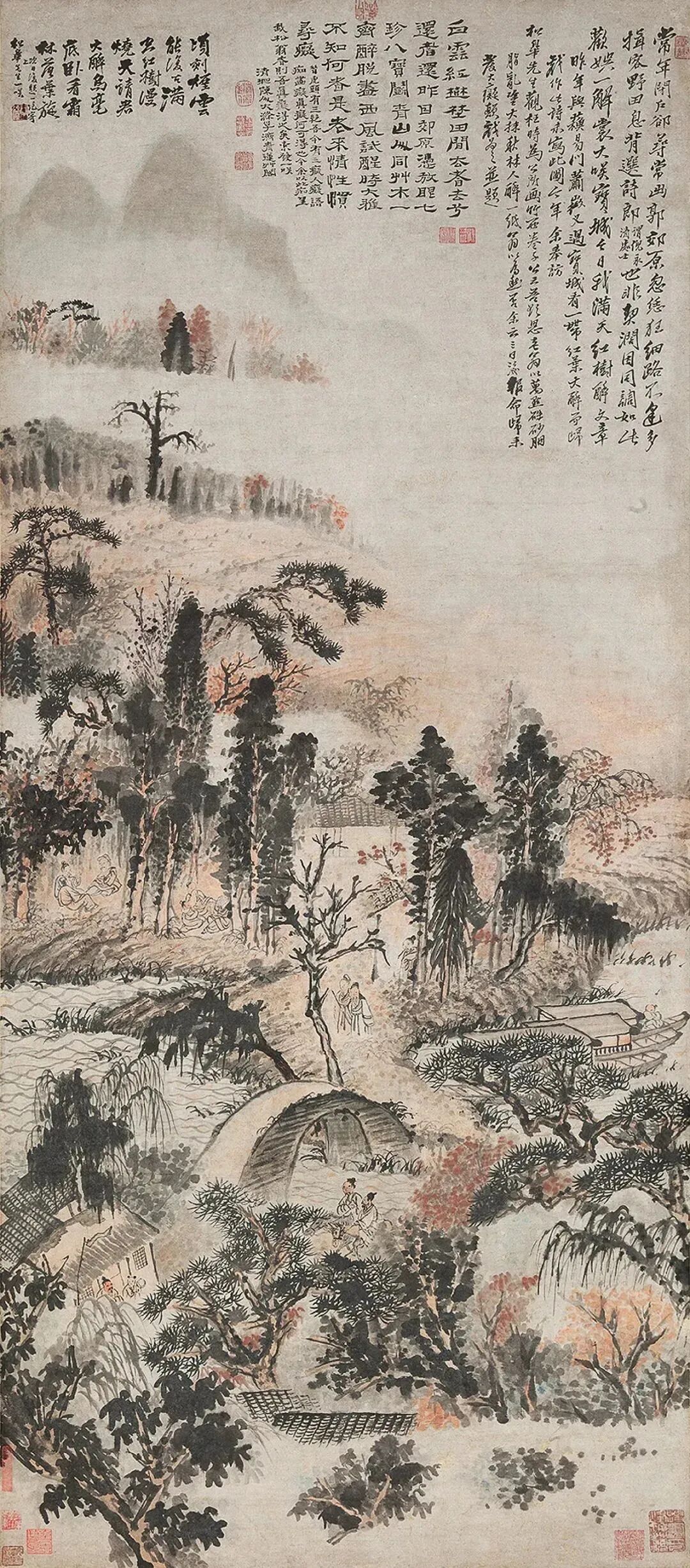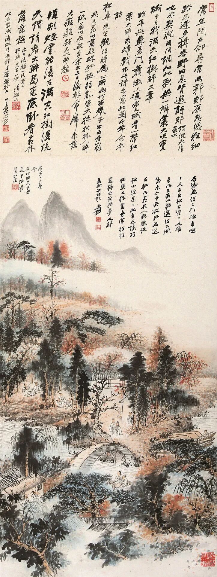 Lot 742 张大千(1899~1983) 秋林人醉图尺寸:画心 95×48.5cm;诗塘 34.5×48.5cm拍品估价:6,000,000 - 8,000,000 人民币1.石涛画往往于极奇险中见平正,极平淡中见雄奇。此其所以能迈往古开后来也。予所收师画近百轴,此霜林人醉图,从极不经意中出奇思,谲巧狂涂大抹。岂寻常拈椎竖拂者所能梦见耶?己丑秋临并记,爰。2.庚寅十月,题奉启培乡仁兄法家正之,大千张爰时同印度。钤印:三千大千、张爰私印、张大千长年大吉又日利、冷透须眉见小乘著录:《沈燕谋日记节钞及其他·五十年代日记》第38页,中华书局(香港)有限公司,2020年。展览:“张大千近作展”,香港圣约翰堂,1950年。1.石涛《秋林人醉图》原为大风堂藏品。上世纪50年代,美国藏家顾洛阜向张大千购藏“大风堂名迹”书画21件,此即其一,后捐赠大都会博物馆,大千先生此件作于1949年,后携至印度,当属得意之作。2.上世纪50年代初,大千先生暂居印度大吉岭,期间往返香港与曼谷等地,为筹办展览奔走。1950年夏,他抵港盘桓数天,于圣约翰堂副堂举行近作展,沈苇窗、沈燕谋、马连良等人均前往参观。沈燕谋在日记中详细记录了当时的情形“一九五〇年七月二十一日,过花园道圣约翰堂观张大千画展,张氏作品陈列百件……所临王叔明《林泉清集》及清湘《秋林人醉》,各有原迹同时陈列,弥觉张氏之作,清幽可爱。”沈燕谋(1891-1971)是江苏南通通州人,我国著名实业家,藏书家和教育家。曾与钱穆合办新亚书院并任校董及图书馆馆长。沈燕谋有写日记的习惯,直至弃世方休。日记上起1947年,下至1971年沈先生逝世止,当中包含极多掌故及珍贵文化信息。3.上款人薛启培,为民国时期首批驻印外交官员。1950年初,张大千受印度全印美术会邀请赴印度新德里举办画展,受到驻印度大使馆官员罗家伦和薛启培的极大帮助,同年10月,张大千为表谢意,将自己珍爱有加的《秋林人醉》拟作赠与薛启培,并复题于画上。《秋林人醉图》是大千先生在四十年代后期少见的临摹石涛作品,张大千在模仿的基础上,融入己意,从与古人合,再到与古人离,张大千完成了对自己、对古人的超越。石涛的原作《秋林人醉图》本就是张大千极为珍视的作品之一。1947年,张大千精心挑选了一批珍藏的古代画作共十二件,印行《大风堂名迹第一集》,由红颜知己李秋君题签,石涛的《秋林人醉图》便为其中之一。在临作中,他尽可能地模拟石涛的构图、笔法,乃至以石涛书风临摹款识,这无疑表明了他对石涛此作的珍视。但他又并非原封不动地临摹。烟云变幻的红叶树林中,醉酒的文人三三两两地坐在地上,纵情玩乐,欣赏漫天的落叶。和石涛的原作不同,张大千对人物面部的描绘更加简单率意。他舍去对细节的模仿而取其精神,更突显出醉客神情迷离的情态,同时丝毫不乏与石涛在笔墨神韵上的契合,可谓与原作交相辉映。作品完成,大千一连题跋数次,累计数百字,钤印十一枚,更足见其对此作的珍爱。1950年初,张大千受印度全印美术会邀请,在印度新德里举办画展,受到民国驻印度大使馆官员罗家伦和薛启培的极大帮助。薛启培与张大千更有乡谊。此时离乡已有一载,故土难回的张大千见到这位同乡,想必泛起不少思乡之情。同年十月,张大千为表情谊,将一路携至印度的这件《秋林人醉》临作赠予薛启培,复题于上。此幅《秋林人醉图》既是大千先生在四十年代后期难得一见的临摹石涛作品,也是大千从模仿到超越古人的精彩呈现,有着独特而深远的价值。