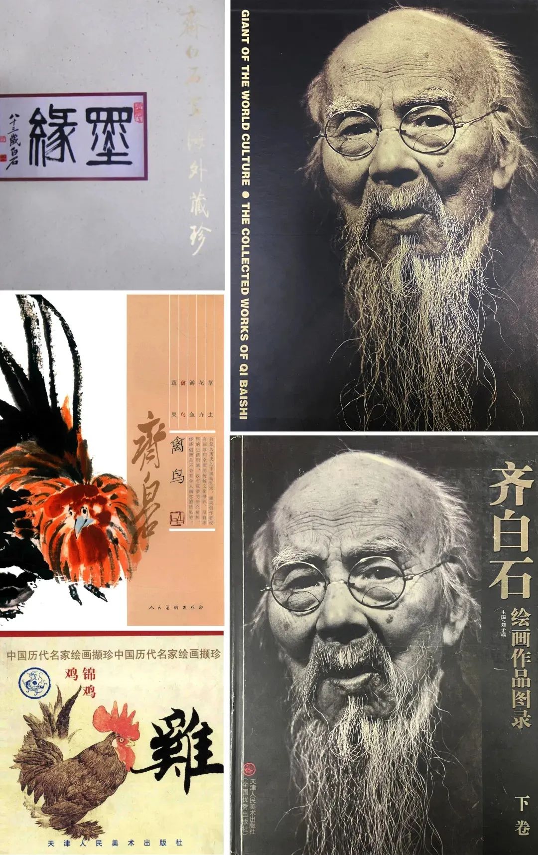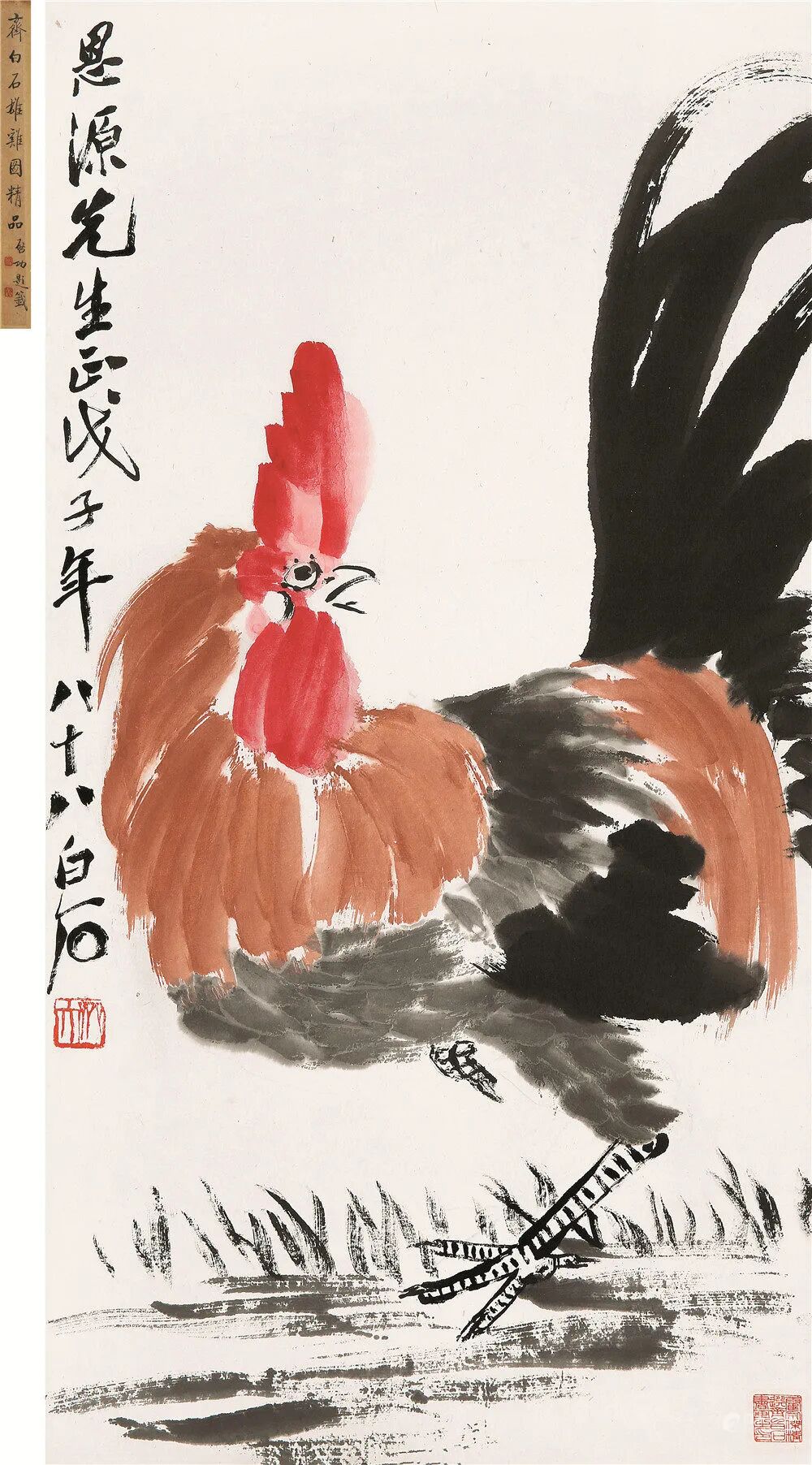 齐白石笔下的公鸡,从造型上看,既不具象,也不抽象,可以说是徘徊在这两者之间,斟酌于形神之际,笔墨间充满超越形似之外的神韵。白石老人凭着对自然和生活的细微观察,从平凡的生活中提炼出深刻的美学理念和审美情趣,由此彻底改变了传统文人画的本质特征,从高处不胜寒的文人世界,转移到了大众百姓中间。千百年来,以公鸡入画,素有“吉祥”、“吉利”之意,就连宋徽宗赵佶也曾作《芙蓉锦鸡图》来歌颂“五德”。鸡有五德之誉,“首戴冠,文也;足博距,武也;敢斗争,勇也;食相告,仁也;晨鸣时,信也。”文武勇仁信,冠文为首。冠谐音官,期谐音鸡,以鸡有高冠,寓“高官有期”之吉语,亦是彼时国人之习俗。白石老人于此着意落笔,冠耸之高、色艳之浓为老人画鸡之最。