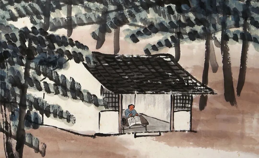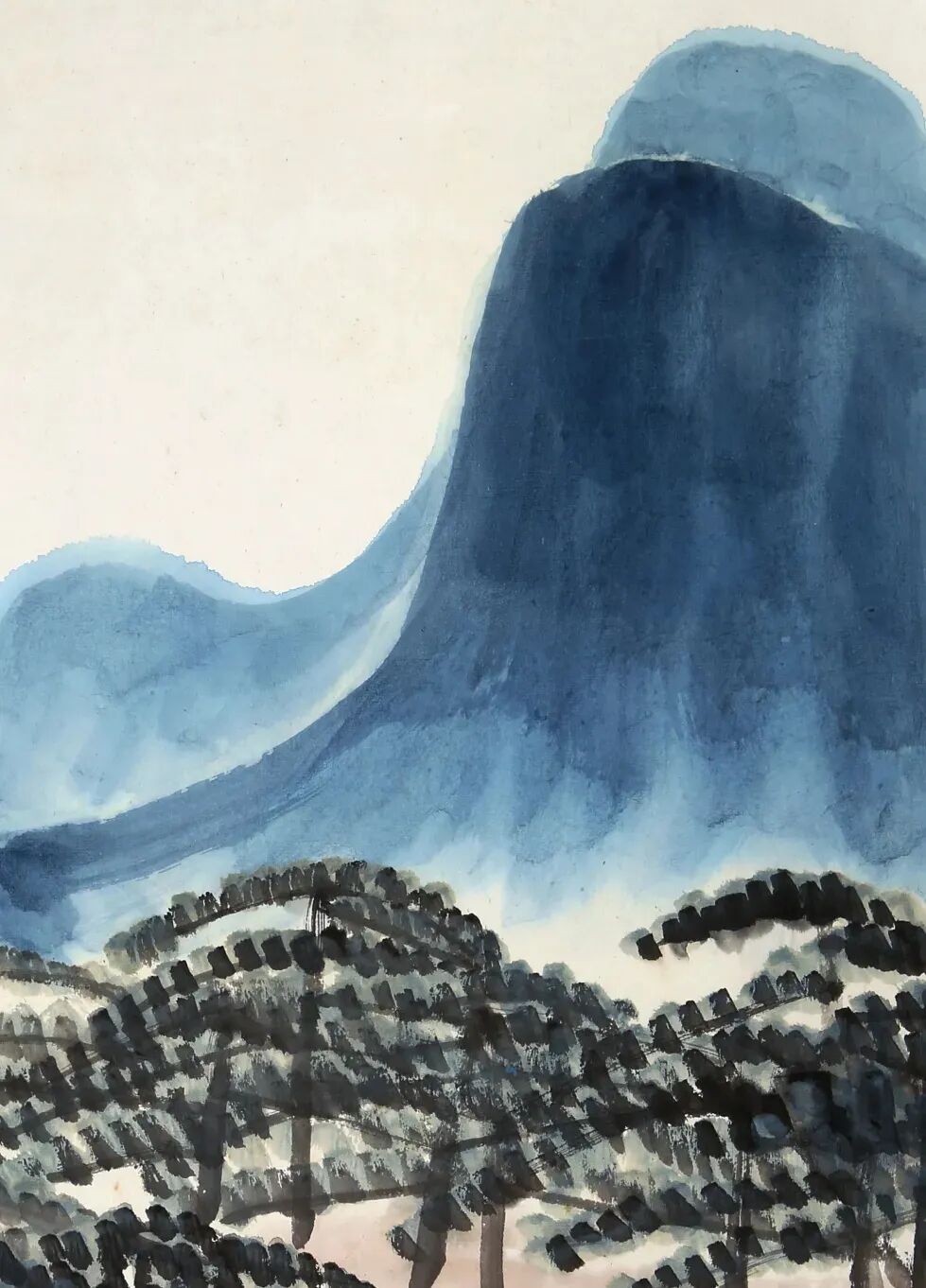 这幅画描绘的正是他“写剧”的场景——在青色的群山与茂密的林木间,一人端坐于瓦屋之内,正在奋笔疾书。写意山水中的山石树木本就愈发简练,齐白石更向前一步,去掉山石的皴笔,只用寥寥几笔铺下简洁的大色块,勾出树木与人物的轮廓,营造出朴实的氛围,又富有清新之趣。一位学者式的艺术家笔耕不倦的形象顿时跃出纸面。
