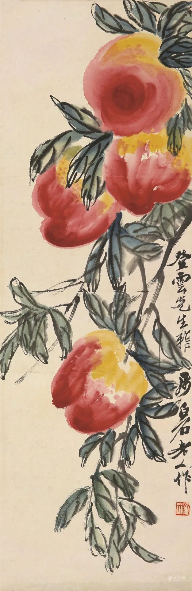 Lot 765 齐白石(1864~1957) 多寿图拍品估价:4,000,000 - 6,000,000 人民币1.《散珍集成(贰)·齐白石卷》第120页,河北教育出版社,2005年。2.《画苑集珍》第40页,上海书店出版社,2006年。3.《银座美术馆馆藏作品选集》第15页,2007年。2.上款人王登云,别字宗山,陕西醴泉人。历任蒋介石的中校英文秘书兼军校政治教官、军校第一教导团党代表。曾参加东征和北伐,历任第三十四师少将师长、第三十四集团军总司令部少将高参、陕南国民兵团团长、陕西省警察局长。此幅多次出版的《多寿图》,画面中白石老人作了四只肥硕的寿桃,用洋红泼写硕大桃实,渗以少许柠檬黄,红黄二色搭配得恰到好处。寿桃虽然仅有寥寥数笔,却画出喜庆祥和的意境,表现出蓬勃的生命力。再以花青、赭墨写出叶子和枝干,后用浓墨勾勒叶筋,设色浓重艳丽。图中明亮的红桃和浓绿的树叶形成鲜明的对比,掩映其间,晕染简洁又富有变化,红与墨、干与湿、浓与淡共同组成了鲜明奔放的视觉效果,情趣盎然。
