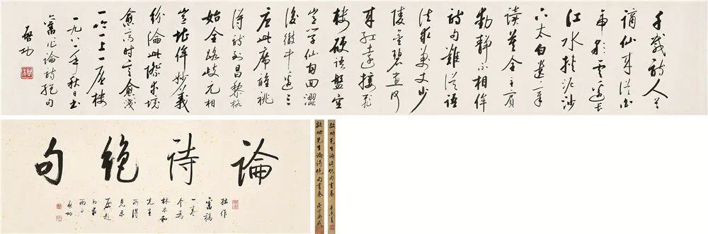 Lot 751 启功(1912~2005) 行书论诗绝句尺寸:画心33.5×208.5cm;引首32×87cm拍品估价:1,800,000 - 2,800,000 人民币引首:论诗绝句。拙作旧稿一卷,今为林木和先生所得,见示属题,即求两正,启功。【钤印】启功、元白、辛未款识:一九八一年秋日,书旧作论诗绝句,启功。【钤印】启功1.上款人林木和为台湾收藏家,任(台北)中华文物学会理事长、清玩雅集理事长、晟铭电子科技股份有限公司董事长。2.米景扬题签。米景扬(b.1936),北京人。擅长中国画。1956年到北京荣宝斋工作,长期从事木版木印画的编辑、描绘工作;60年代在故宫博物院从事古画复制工作。历任北京荣宝斋编辑、副编审、副总经理。