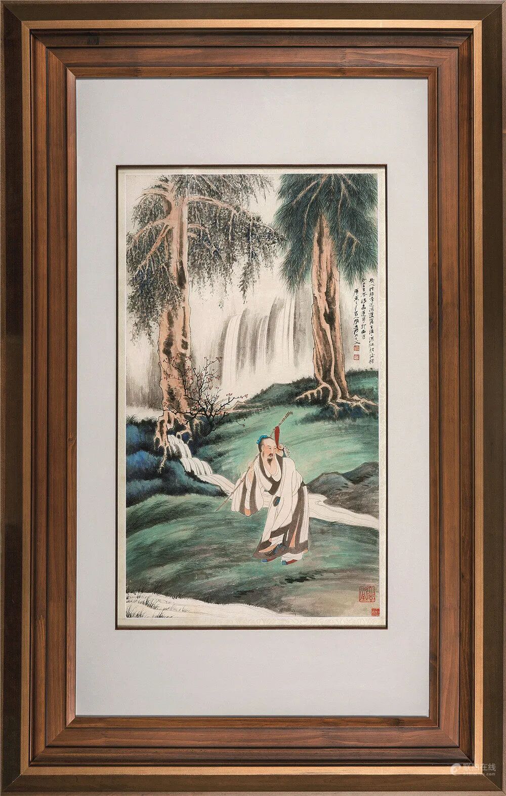 Lot 738 张大千(1899~1983) 杖经图拍品估价:3,000,000 - 4,000,000 人民币款识:几人行路叹迷阳,护落生涯一酒狂。肘后楞迦书百卷,眼前莲萼即西方。庚寅二月,蜀人张爰大千父。1.《张大千精品集(下卷)》第363页,人民美术出版社,2013年。2.《张大千精品画集》第239页,上海人民美术出版社,2014年。说明:黄维熊旧藏。黄维熊,香港著名收藏家,经营“大雅古玩店”,与著名收藏家邓苍梧等人友善,收藏各名家作品甚富。香港翰墨轩《名家翰墨》刊名即来自其旧藏的明人邝露作品。此件《杖经图》作于庚寅(1950年),是年张大千考察临摹阿坚塔壁画,这一年张大千创作颇丰。此作应是在考察临摹阿坚塔壁画前所作,设色浓艳,树木苍翠,人物形态生动,栩栩如生。图画正中写一高士负瓢杖经,衣纹线条流畅,用笔爽利;人物开脸清秀,眉宇间有飘然出尘之致,与画面气氛、意境契合。在诸本中,本幅的局部修饰最精细讲究,地陂前后缀以细草幼枝,皆细笔状写,置铺排疏密有序,足见画家之用心。高士身后松柏各一株,远处一瀑布,地面灌木杂草之外,更有一曲流水,水声潺潺。遒劲的用笔把松柏百年的沧桑表现的淋漓尽致,流畅的线条把高士的神情描绘的惟妙惟肖。此类构图本是传统中国画家法,不仅是为画面的有机协调和丰富,更为充分展示绘者对描摹各种意象的驾驭能力。此类“杖经高士”题材的作品大千笔下曾有数本,人物造型当同出一稿,仅背景略有繁简不同。张大千对这一构图方式作了比较大的改革,使之烙上张氏之印。目前我们能看到的,就有四件。此幅作品的画面与前几张相较也已趋丰富,画家并不自囿于对初稿的惬意,随着时间推移而不断探求变化,在同中显异,这也是大千艺术发展没有停滞之底因。若从整体构图、用笔细致以至题诗及叙明出处等细节视之,称曰同一题材最精绝者,亦非过誉。此后大千萍踪飘荡,此类工笔人物日渐稀见矣。![]()