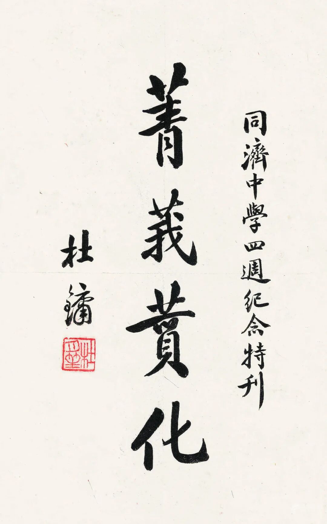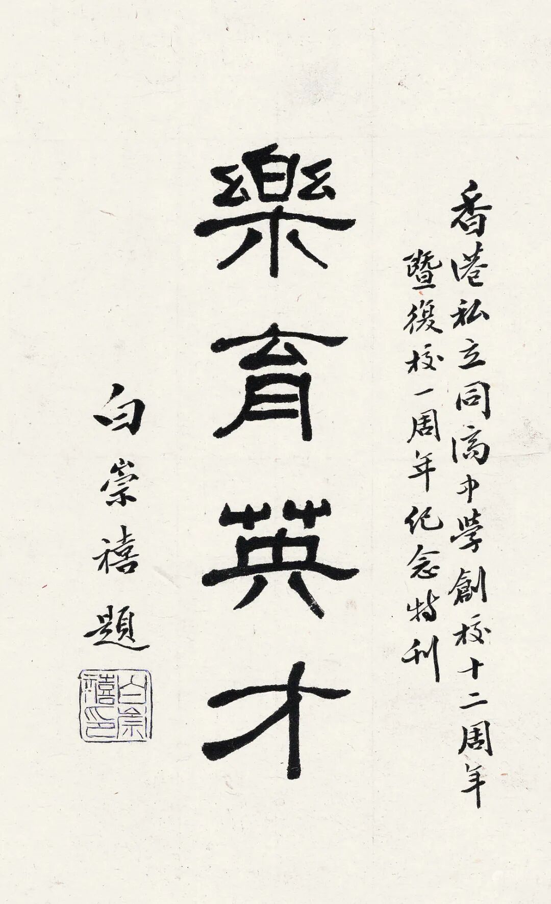 Lot 13 白崇禧(1893~1966) 隶书“乐育英才”款识:香港私立同济中学创校十二周年暨复校一周年纪念特刊,白崇禧题。