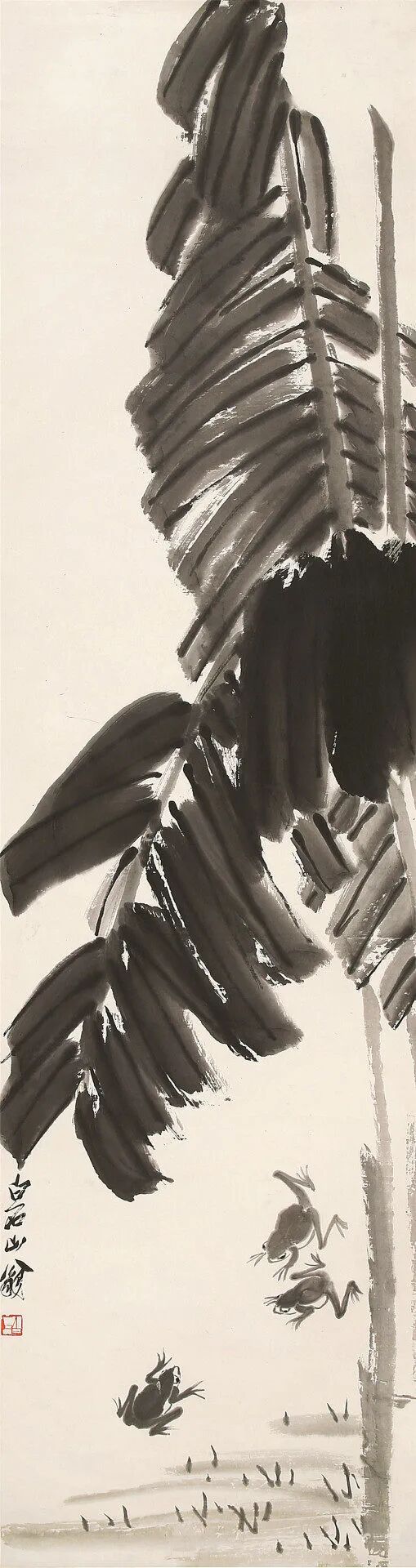 Lot 764 齐白石(1864~1957) 芭蕉蛙趣图拍品估价:1,000,000 - 1,500,000 人民币1.《齐白石画集》第42页,台湾国华书画出版社,1984年。2.《齐白石绘画艺术》第72页,山东美术出版社,1988年。4.《银座风韵—银座美术馆馆藏作品集》第194页, 山东美术出版社,2007年。此幅《芭蕉蛙趣图》多次出版,其中两次为80年代出版,画面中硕大的两片芭蕉叶占据了画面三分之二的位置,三只煞有其事的“开会青蛙”,一副不可叫人听去的神秘。画面的节奏把握得恰到好处,虚实得当,主次分明,三主角各有神态,手舞足蹈的发言者,屏气聚神的聆听者,愈加辩驳的质疑者,仿佛置身于故事之中。画面中的芭蕉叶茎为中锋行笔画出,主茎劲挺有力,侧枝俯仰生姿,线条流畅而随意。在看似简单随意的画面效果中,通过墨色浓淡及方向的精心安排,前后穿插关系与层次非常明确。叶子的处理大致是先以大笔侧锋铺设,而后用中锋重墨勾叶子的筋脉。此画最具传神之处莫过于三只青蛙的处理,头部与身子皆用两笔画出,再画四肢,勾勒出肚皮,最后点睛。看似简单,寥寥几笔,似乎连儿童都可以模仿得很像。然而齐白石画的不易之处,也在这寥寥几笔。