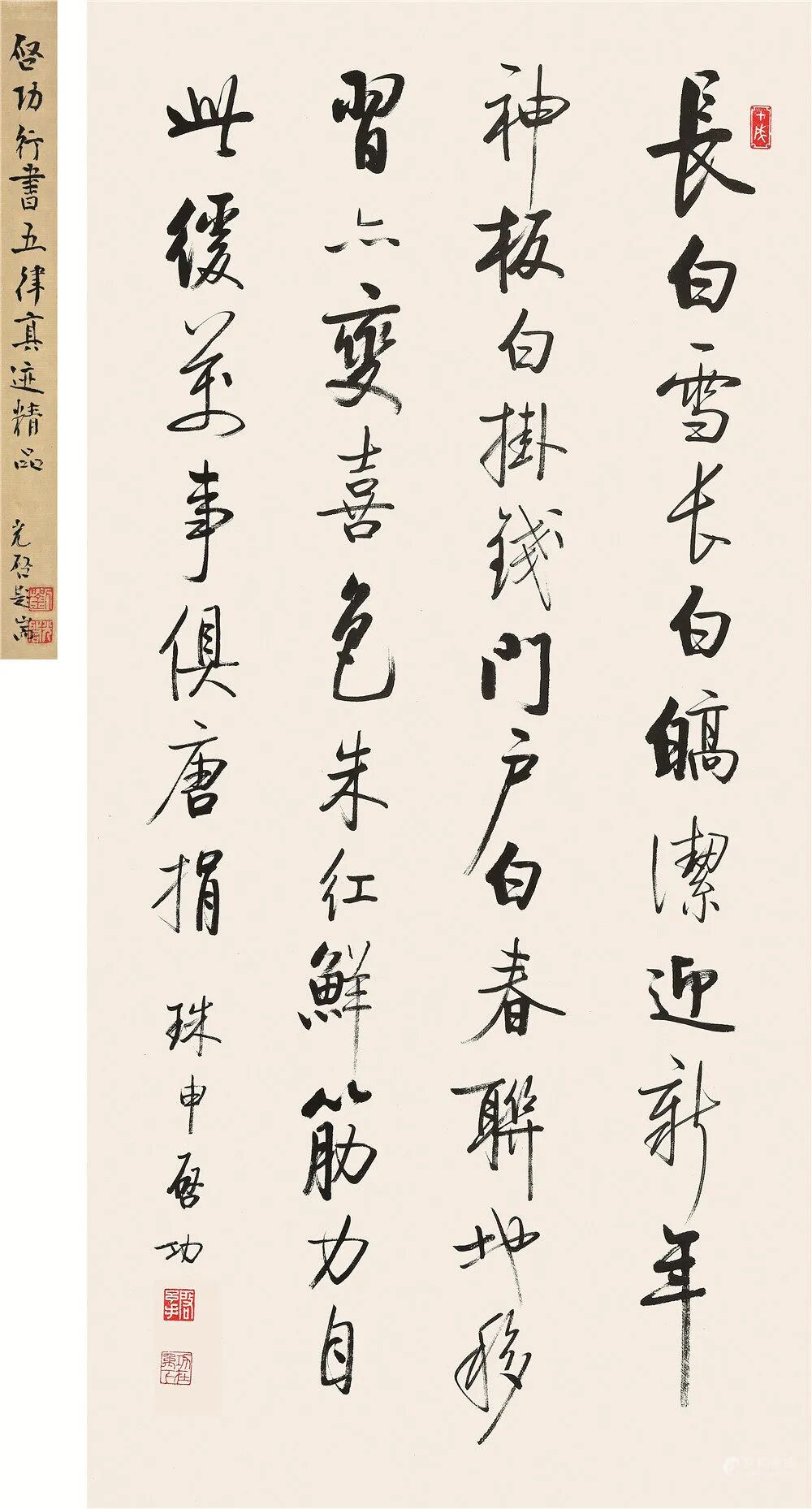 Lot 205 启功(1912~2005) 行书五言诗拍品估价:600,000 - 800,000 人民币展览:“景行维贤—启功作品展”,荣宝斋主办,2021年5月。1.刘光启题签。刘光启(1932-2019),著名书画鉴定专家。生于河北省冀县,国家文物鉴定委员会委员。天津市文物鉴定委员会委员、天津市文史馆馆员。2.即将着录于《景行维贤—启功作品集Ⅲ》,荣宝斋。