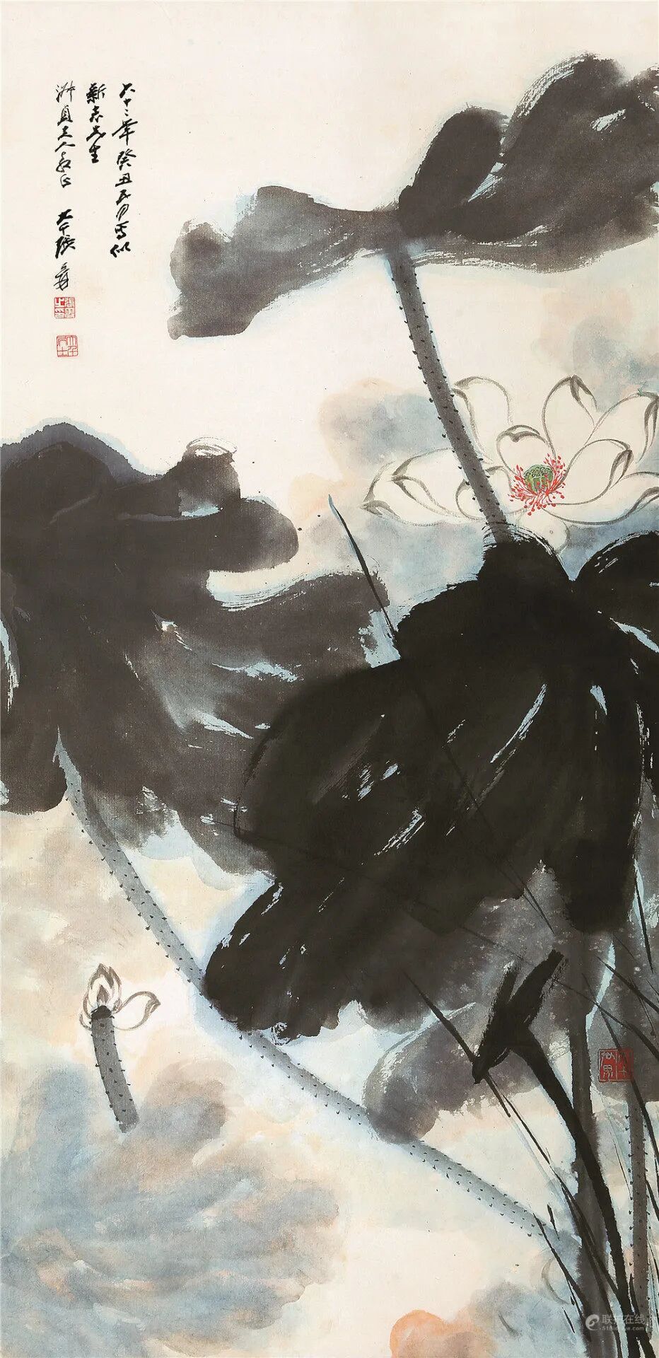 Lot 736 张大千(1899~1983) 水殿幽香拍品估价:1,000,000 - 1,200,000 人民币款识:六十二年癸丑五月,写似新志先生、淑贞夫人教正,大千张爰。60岁后,大千去世界各地旅行,受现代绘画启发,在参法传统笔墨基础上,独创泼彩泼墨画法,使其艺术得之古典艺术的浓厚底蕴,又具独特气息。墨荷这一题材,大千居士晚年常画,以泼墨之法挥洒出荷之亭亭玉立、娉婷婀娜之态,为其画作之一绝。是作水墨淋漓,大气磅礴,荷花荷叶几乎占满了画幅,奇特的构图方式让人眼前一亮。荷叶如伞盖,以水墨大笔涂抹、泼洒而成,恣意动人,水墨交汇恰表现出了叶片独特的质感。荷心看上去宛如矗立水中央一般,白荷掩映其中,顾盼相应,姿丰态动。整体观之,处处布局精心,淡雅而大气。造化与心源全都溶化在田田荷叶,脉脉荷花的血液之中,确为大千晚年变法后画荷之力作。