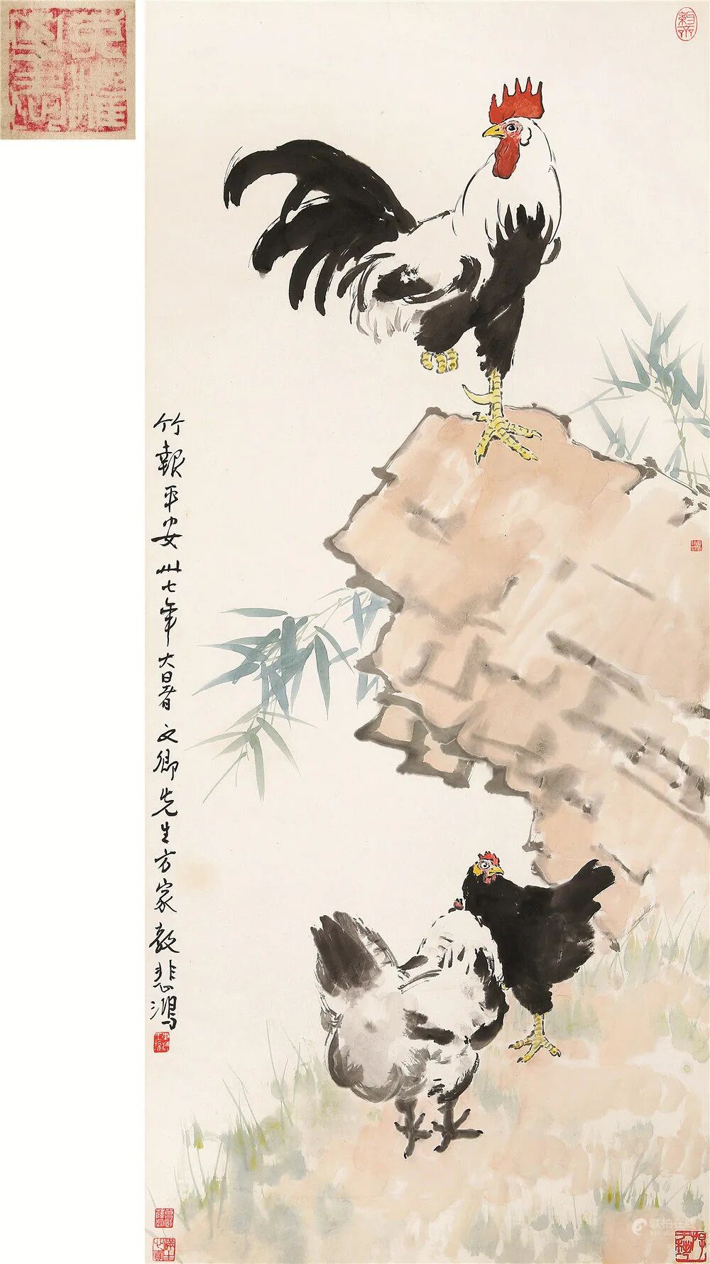 Lot 762 徐悲鸿(1895~1953) 竹报平安拍品估价:1,000,000 - 1,500,000 人民币款识:竹报平安。卅七年大暑,文卿先生方家教,悲鸿。鉴藏印:曾藏薛处、满生心赏、约斋、麟庐珍藏、英权至爱(包首处)1.《徐悲鸿作品集》第220-221页,文物出版社,2007年。2.《银座风韵—银座美术馆馆藏作品集》第278页,山东美术出版社,2007年。3.《银座美术馆馆藏作品选集》第57页,2007年。3.上款人薛满生,号文卿,室名约斋,江苏无锡人。早年留学日本,曾任伪满洲国国务秘书,上世纪四十年代后期活跃于北京书画界,与齐白石、徐悲鸿等人皆有往还。精鉴藏,有“江东巨眼”之称,其四十年代中后期于长春所购的清宫流散书画,今为无锡市博物馆重要藏品。《竹报平安》创作于1948年,赠与有“江东巨眼”之誉的大藏家薛满生。雄鸡与竹子、雄鸡与母鸡的组合通常是为了表达美好的祝愿,“竹”用以象正直;“鸡”能报晓,所谓“雄鸡一声天下白”,合起来在中国老套说法称作“竹报平安”。而鸡亦谐音吉,寓意祥和。这类作品往往不同于一般的应酬之作,常画来馈赠志同道合的友朋,题名及上款者尤多佳作。此幅赠予方家薛满生,落笔自然格外经意,洵为杰构。此幅作品画面采取了徐悲鸿所常用的格式,一只雄鸡立于盘石上,极目四顾,所不同的是,盘石下面的草丛里,增添了两只正在觅食的母鸡,这一幕便融合了英雄气概与生活闲趣。雄鸡造型生动,身姿挺拔,尾巴翘立,羽毛鼓起,昂首凝视,气势凛然,不容侵犯。其冠色鲜红,胸部敷白粉,几笔粗朴的浓墨扫出尾巴,红、白、黑相映衬,色彩耀目。奇石呈险势而出,石下杂草丛生,两只母鸡正在觅食,其浑圆的身躯,闲适的姿态与雄鸡构成鲜明的对比。整体构图巧妙,造型准确,笔墨在粗率写意与精谨细致之间交替,色彩在冲突中走向和谐。
