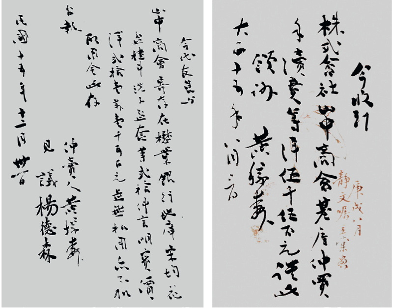 左: 今代友售予山中商会寄存在懋业银行地库宋钧花盆、楂斗、洗子、盃、奁等二十件,言明实价,洋二十一万一千五百元。并无扣用,亦不加取用金。此存。公执。仲卖人:黄稼寿。见议:杨德森。民国十五年十二月三十一日。