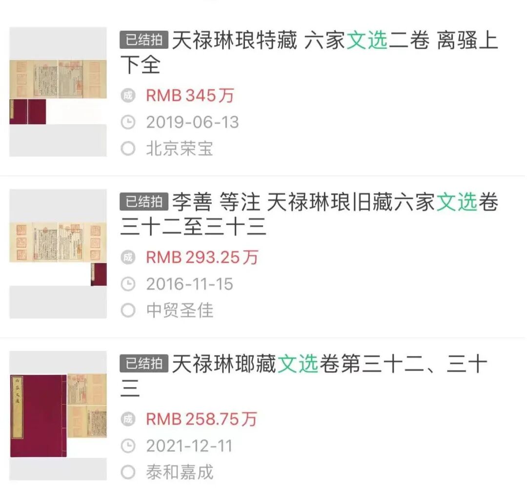 泰和嘉诚作为古籍拍卖的传统大行,2021年度共征集到4件天禄琳琅拍品,是2021年度征集到天禄琳琅古籍最多的拍卖行,4件天禄琳琅古籍拍品涵盖宋、元、明各个时代刻本,除《朱子语类》以100万起拍流拍之外,其余3件均成功成交,3件共计拍得1334万元。其中2021年泰和嘉诚秋拍《天禄琳琅藏通鉴总类第八》拍得471.5万,这件曾在2019年北京荣宝秋拍以425.5万落槌,2年增值约1.1倍。2021年泰和嘉诚秋拍《天禄琳瑯藏文选卷第三十二、三十三》拍得258.75万元,这件曾在北京荣宝春拍以345万元落槌,贬值86.25万元。258.75万元的价格甚至比这件拍品在2016年的在中贸圣佳秋拍的价格293.25万元还要低34.5万元。这样再次说明2021年古籍拍卖价格受到疫情和经济形势的严重影响,古籍收藏市场的形势严峻并不容乐观。
