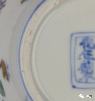 成化斗彩鸡缸真品的双方框底款笔道刚劲有力,双线不论是直线还是略微弧形,都相对平行。字体书写圆润流畅,行笔至笔锋转折处略慢,停笔时会出现积料现象,青花发色深蓝。