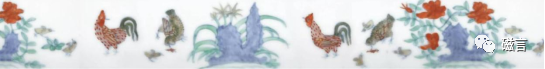 在绘画技法上,成化斗彩瓷器体现了典型的明代艺术风格,绘画上并不追求一丝不苟,而是随手画来,带有一种强烈的稚拙感。鸡缸杯外壁饰子母鸡两群,描绘鸡啄早哺雏,姿态灵动,栩栩如生,间以湖石、月季、幽兰,一派初春景象,尽显写生之趣。