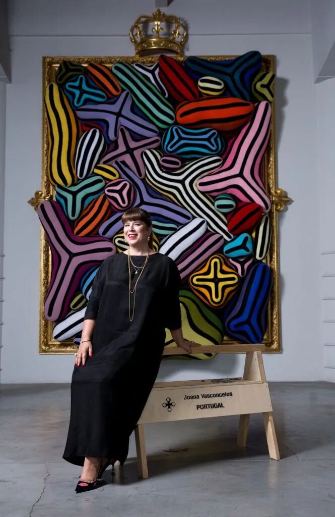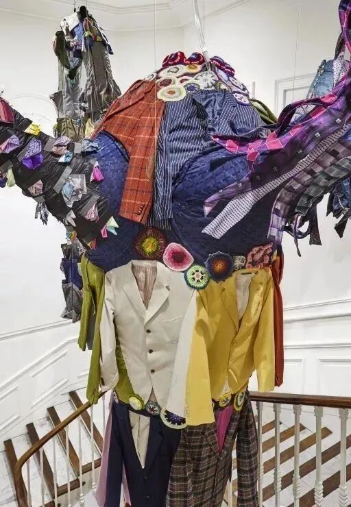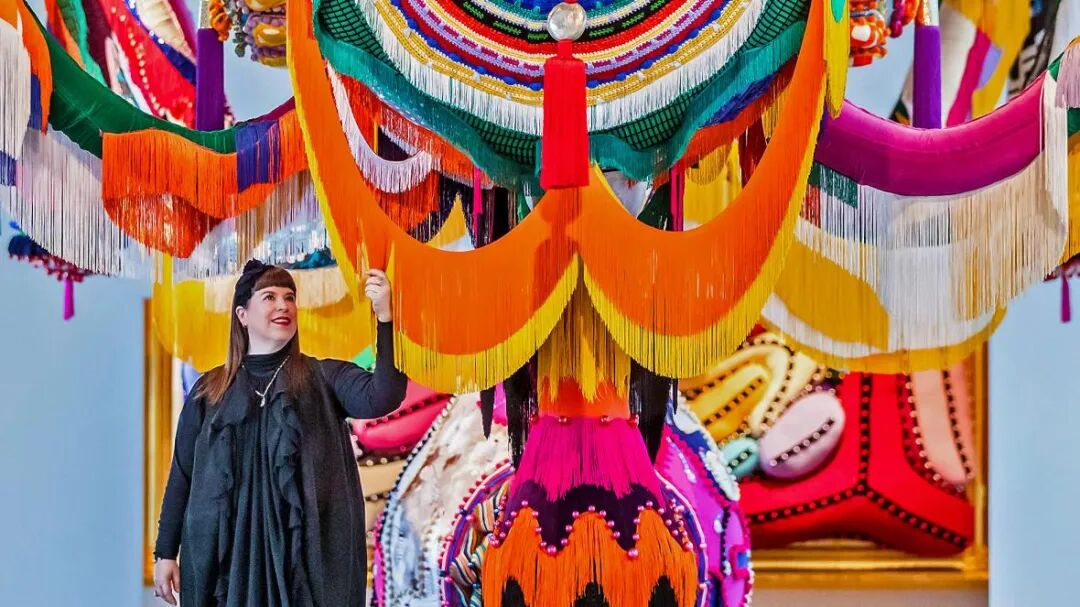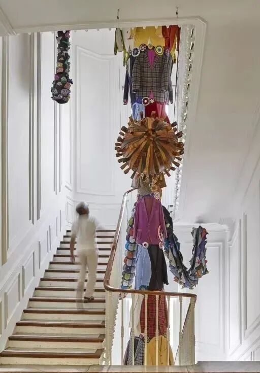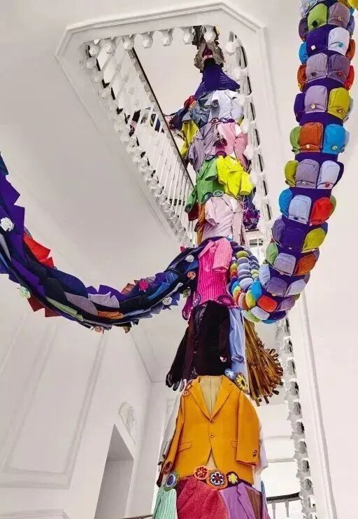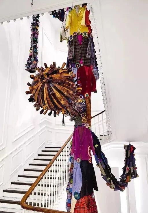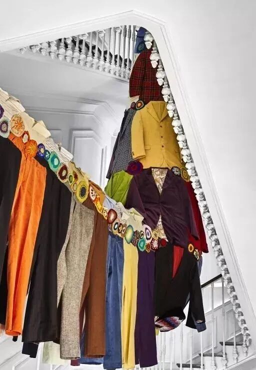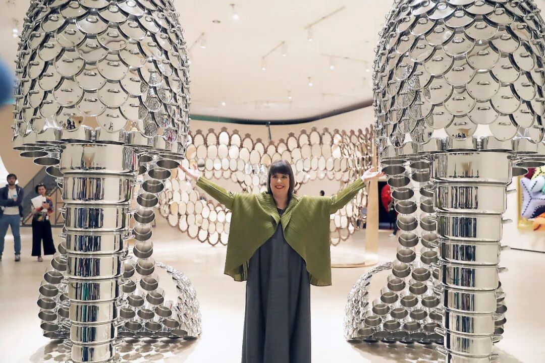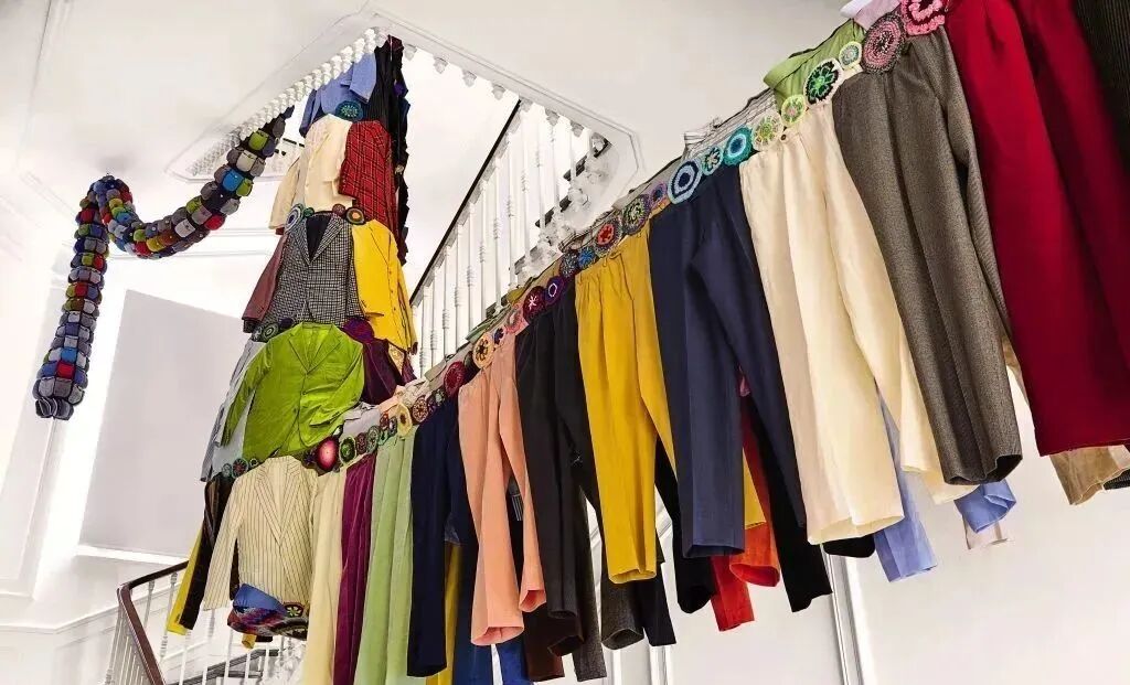 看第二眼才发现,是由一件件五颜六色的衣服裤子组成的:以上这些作品背后的“神秘玩家”,就是来自葡萄牙的艺术家Joana Vasconcelos。她是第一个在法国凡尔赛宫举办个人展览的女性艺术家。作为当代最具创造力的女性艺术家之一,Joana Vasconcelos擅长用不同的媒介制作出巨型尺寸的新型艺术装置,而且每件都各有特色。她最著名的作品,就是这件用不锈钢锅完成的雕塑作品《玛丽莲》(Marilyn)。这件作品的寓意是——每位家庭主妇与玛丽莲·梦露之间存在的“现实矛盾”。每位终日埋没于茶米油盐、孩子尿不湿的家庭主妇,心中其实都有个“玛丽莲·梦露”之梦。最后,这件作品不仅荣登凡尔赛宫的“大雅之堂”,还出现在众多重要的欧洲城市的艺术馆中,成为Joana最受欢迎的打卡作品。Joana Vasconcelos的大部分作品都取自日常生活中简单的材料,包括服装、织物、陶瓷等,结合刺绣和钩针等传统的葡萄牙工艺,多种元素混搭被重新组合为全新的复杂样式艺术作品,给观众带来震撼人心的视觉体验。她常常从女性的视角出发,结合杜尚(Marcel Duchamp)的艺术概念、路易丝·布尔乔亚(Louise Bourgeois)的雕塑结构,以及安迪·沃霍尔(Andy Warhol)艺术中的消费文化。可以说,的作品就是集波普、娱乐、概念、政治于一体的艺术总体。