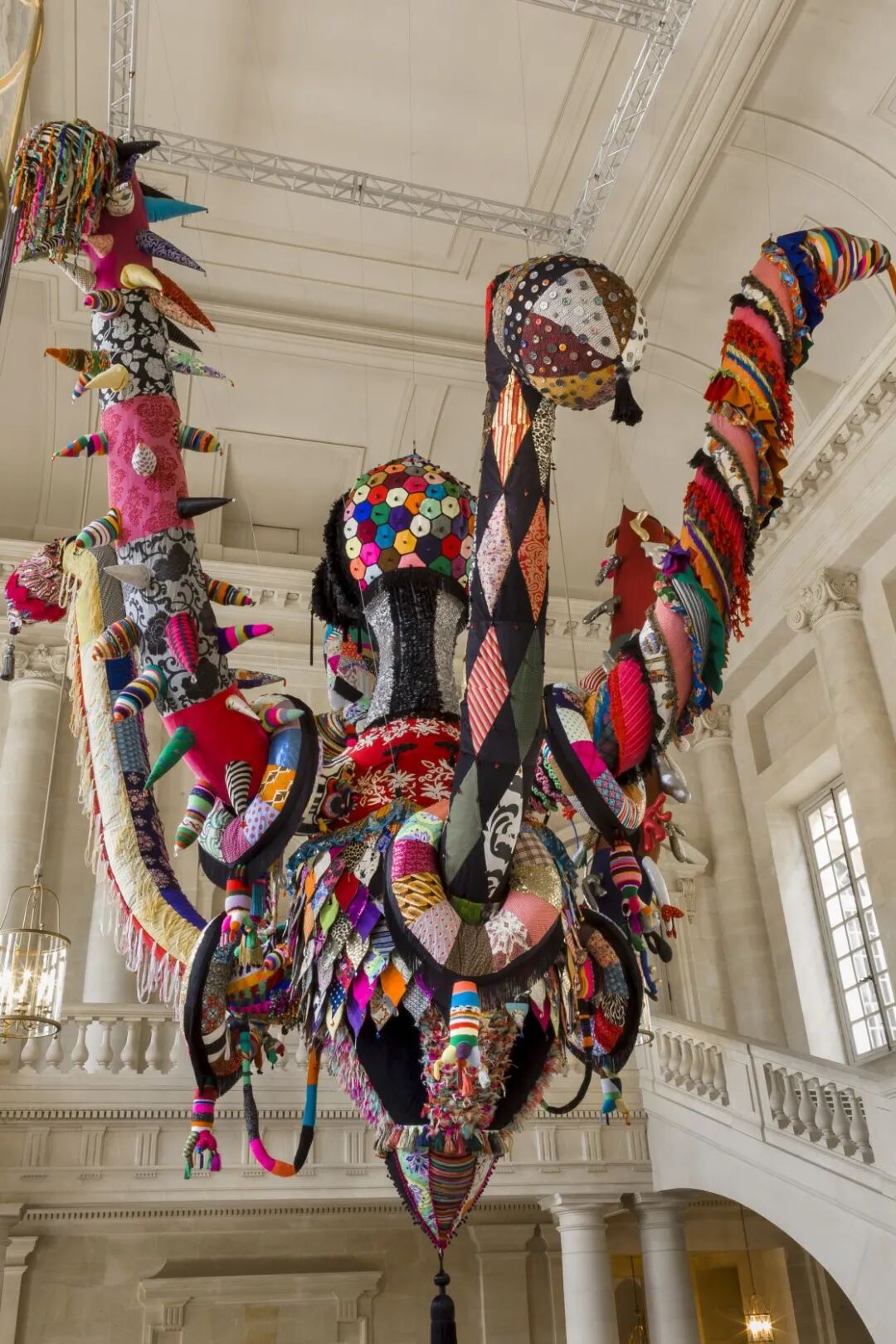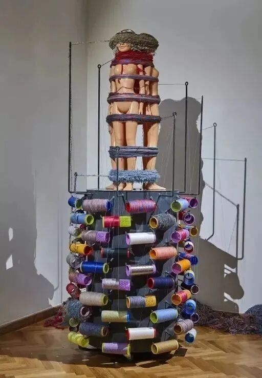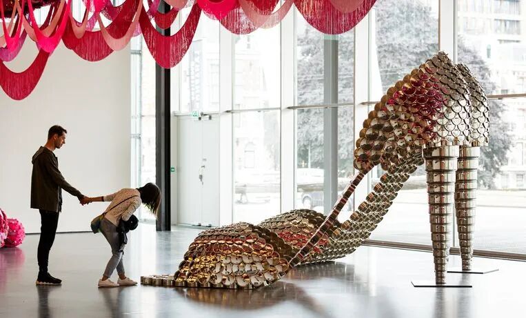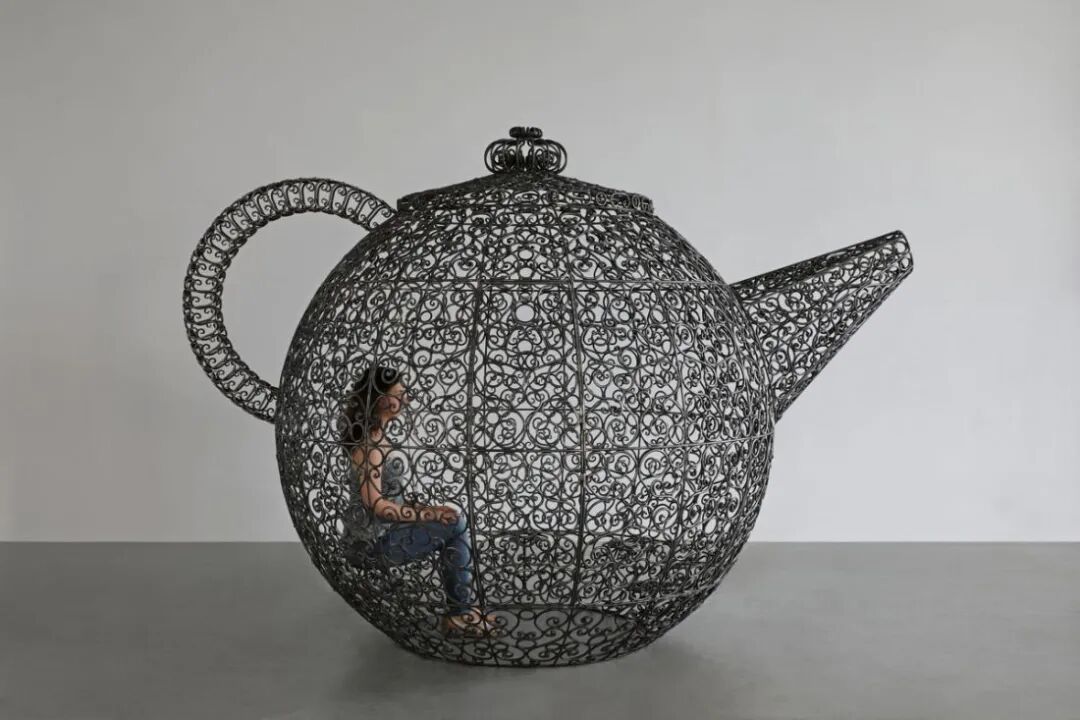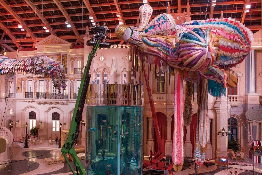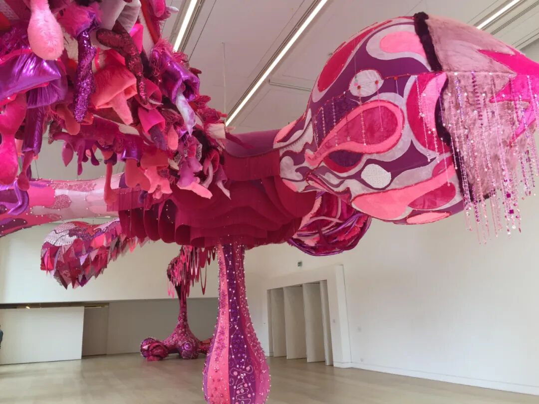 看第二眼才发现,是由一件件五颜六色的衣服裤子组成的:以上这些作品背后的“神秘玩家”,就是来自葡萄牙的艺术家Joana Vasconcelos。她是第一个在法国凡尔赛宫举办个人展览的女性艺术家。作为当代最具创造力的女性艺术家之一,Joana Vasconcelos擅长用不同的媒介制作出巨型尺寸的新型艺术装置,而且每件都各有特色。她最著名的作品,就是这件用不锈钢锅完成的雕塑作品《玛丽莲》(Marilyn)。这件作品的寓意是——每位家庭主妇与玛丽莲·梦露之间存在的“现实矛盾”。每位终日埋没于茶米油盐、孩子尿不湿的家庭主妇,心中其实都有个“玛丽莲·梦露”之梦。最后,这件作品不仅荣登凡尔赛宫的“大雅之堂”,还出现在众多重要的欧洲城市的艺术馆中,成为Joana最受欢迎的打卡作品。Joana Vasconcelos的大部分作品都取自日常生活中简单的材料,包括服装、织物、陶瓷等,结合刺绣和钩针等传统的葡萄牙工艺,多种元素混搭被重新组合为全新的复杂样式艺术作品,给观众带来震撼人心的视觉体验。她常常从女性的视角出发,结合杜尚(Marcel Duchamp)的艺术概念、路易丝·布尔乔亚(Louise Bourgeois)的雕塑结构,以及安迪·沃霍尔(Andy Warhol)艺术中的消费文化。可以说,的作品就是集波普、娱乐、概念、政治于一体的艺术总体。