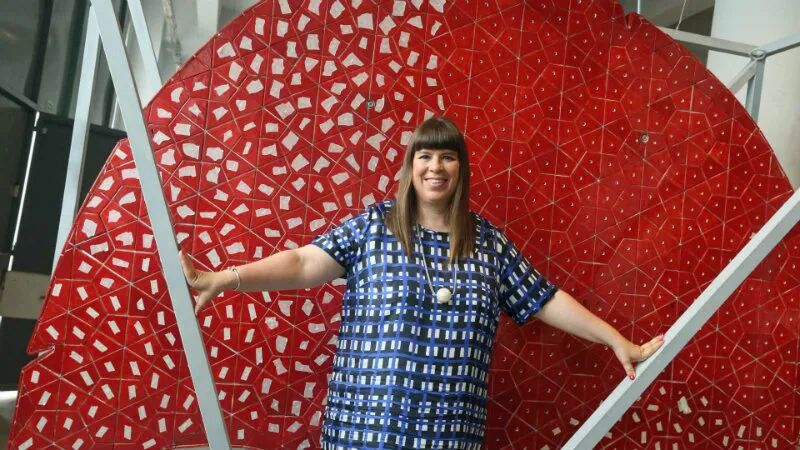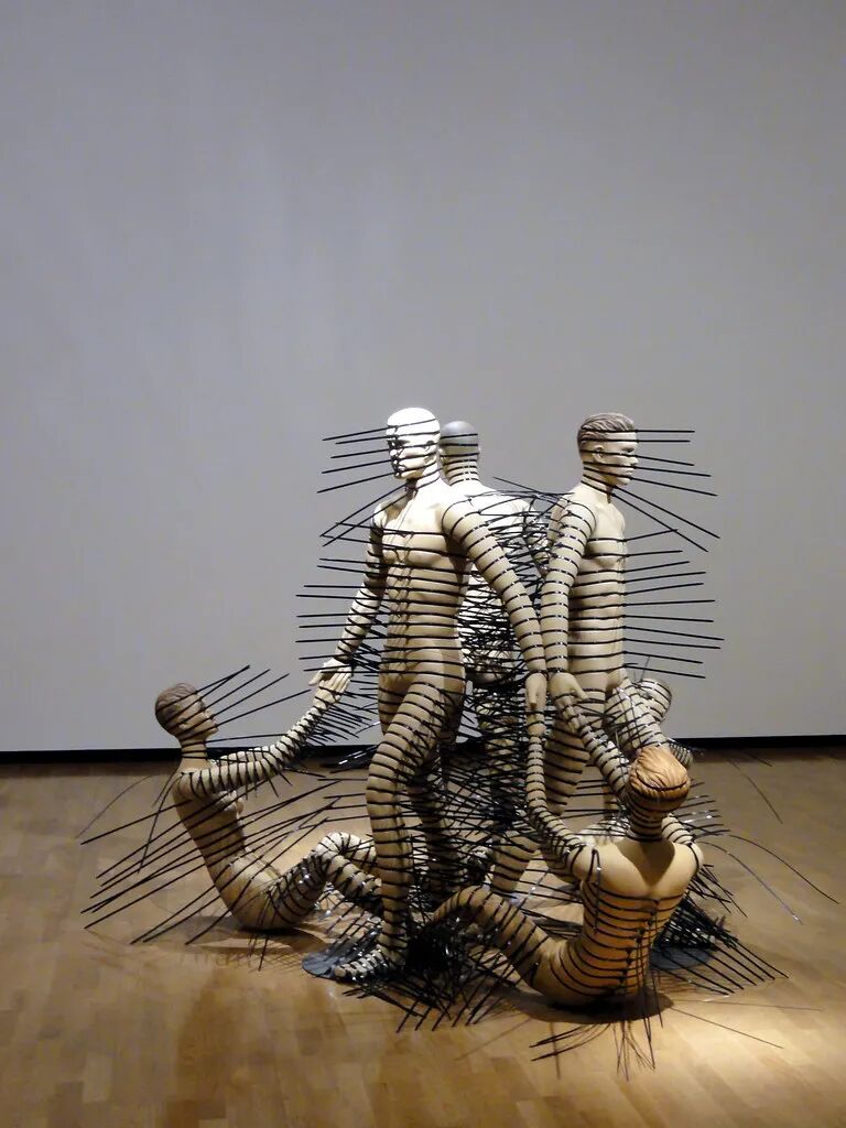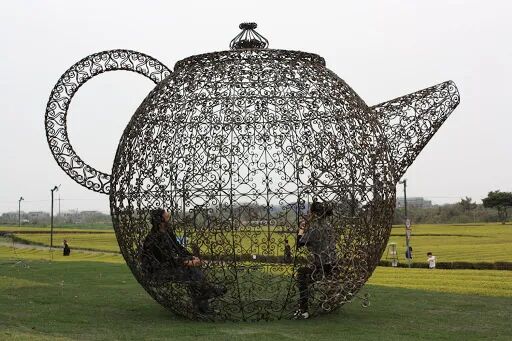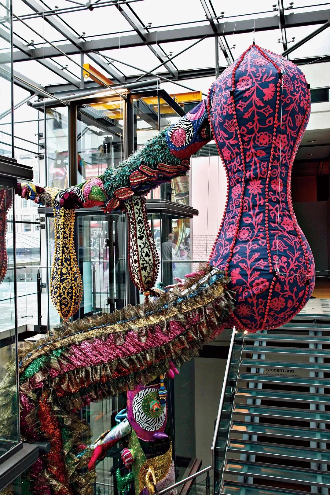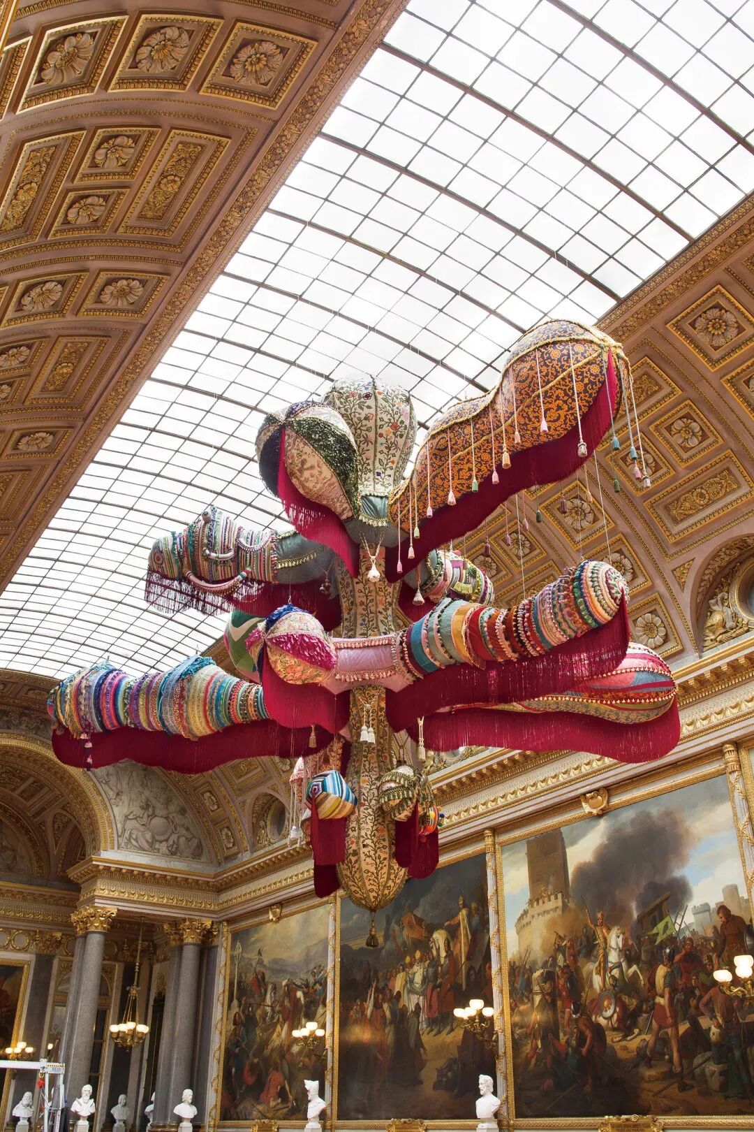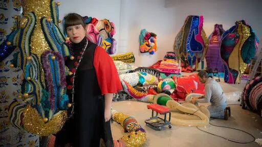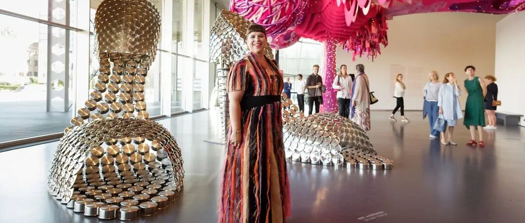 看第二眼才发现,是由一件件五颜六色的衣服裤子组成的:以上这些作品背后的“神秘玩家”,就是来自葡萄牙的艺术家Joana Vasconcelos。她是第一个在法国凡尔赛宫举办个人展览的女性艺术家。作为当代最具创造力的女性艺术家之一,Joana Vasconcelos擅长用不同的媒介制作出巨型尺寸的新型艺术装置,而且每件都各有特色。她最著名的作品,就是这件用不锈钢锅完成的雕塑作品《玛丽莲》(Marilyn)。这件作品的寓意是——每位家庭主妇与玛丽莲·梦露之间存在的“现实矛盾”。每位终日埋没于茶米油盐、孩子尿不湿的家庭主妇,心中其实都有个“玛丽莲·梦露”之梦。最后,这件作品不仅荣登凡尔赛宫的“大雅之堂”,还出现在众多重要的欧洲城市的艺术馆中,成为Joana最受欢迎的打卡作品。Joana Vasconcelos的大部分作品都取自日常生活中简单的材料,包括服装、织物、陶瓷等,结合刺绣和钩针等传统的葡萄牙工艺,多种元素混搭被重新组合为全新的复杂样式艺术作品,给观众带来震撼人心的视觉体验。她常常从女性的视角出发,结合杜尚(Marcel Duchamp)的艺术概念、路易丝·布尔乔亚(Louise Bourgeois)的雕塑结构,以及安迪·沃霍尔(Andy Warhol)艺术中的消费文化。可以说,的作品就是集波普、娱乐、概念、政治于一体的艺术总体。