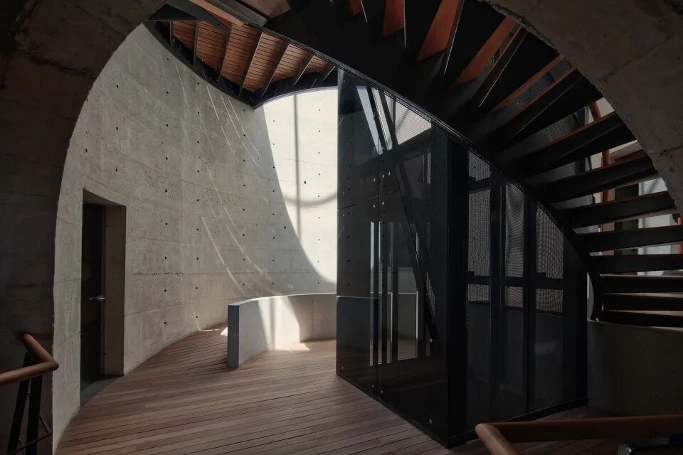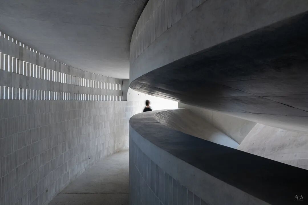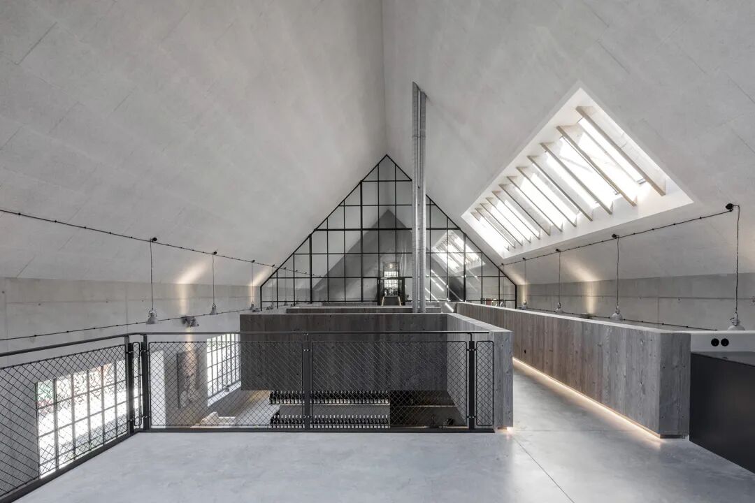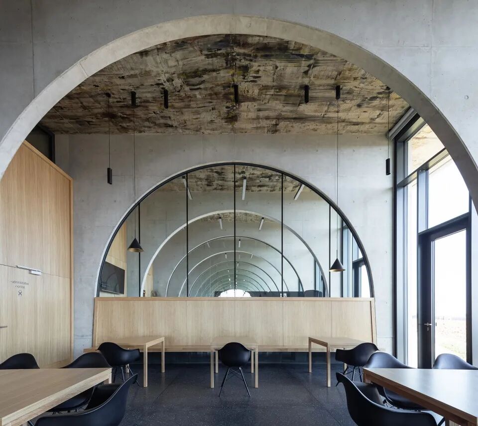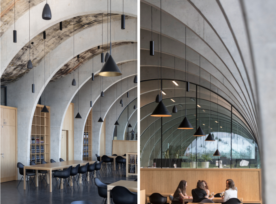 高耸的凹面屋顶延伸出一个巨大的酒窖空间,由裸露的肋骨拱结构支撑,是典型的捷克风格。每根钢筋混凝土拱都根据天花的特定弧度设计,间距与周围葡萄藤保持一致。它们贯穿整个空间,在葡萄藤间缓缓升起,形成了完美的对称效果,吸引了来访者的视线。