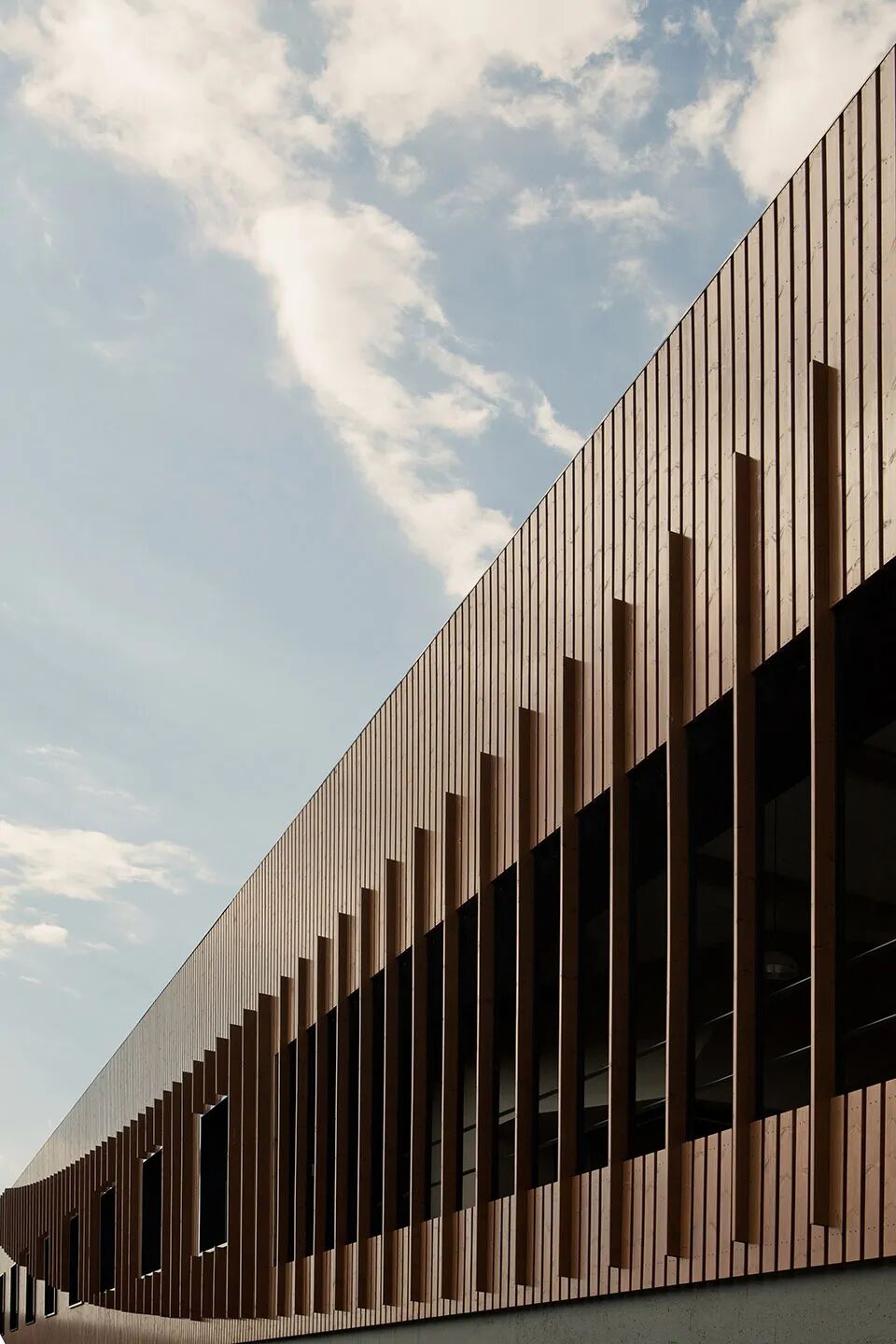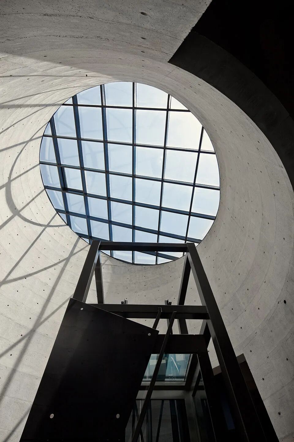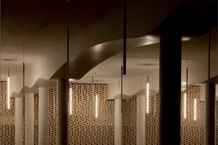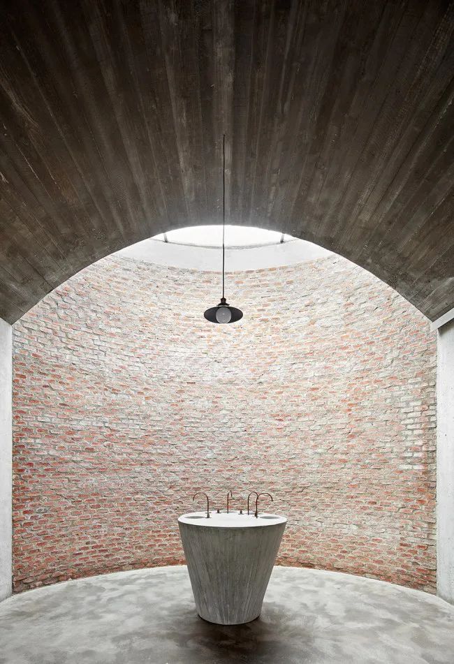 高耸的凹面屋顶延伸出一个巨大的酒窖空间,由裸露的肋骨拱结构支撑,是典型的捷克风格。每根钢筋混凝土拱都根据天花的特定弧度设计,间距与周围葡萄藤保持一致。它们贯穿整个空间,在葡萄藤间缓缓升起,形成了完美的对称效果,吸引了来访者的视线。