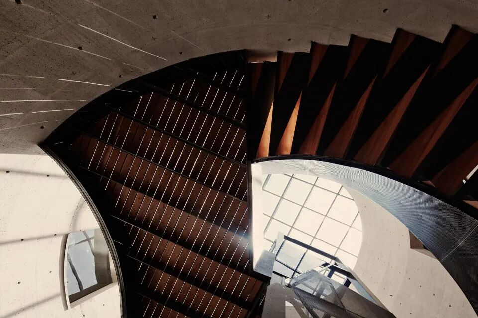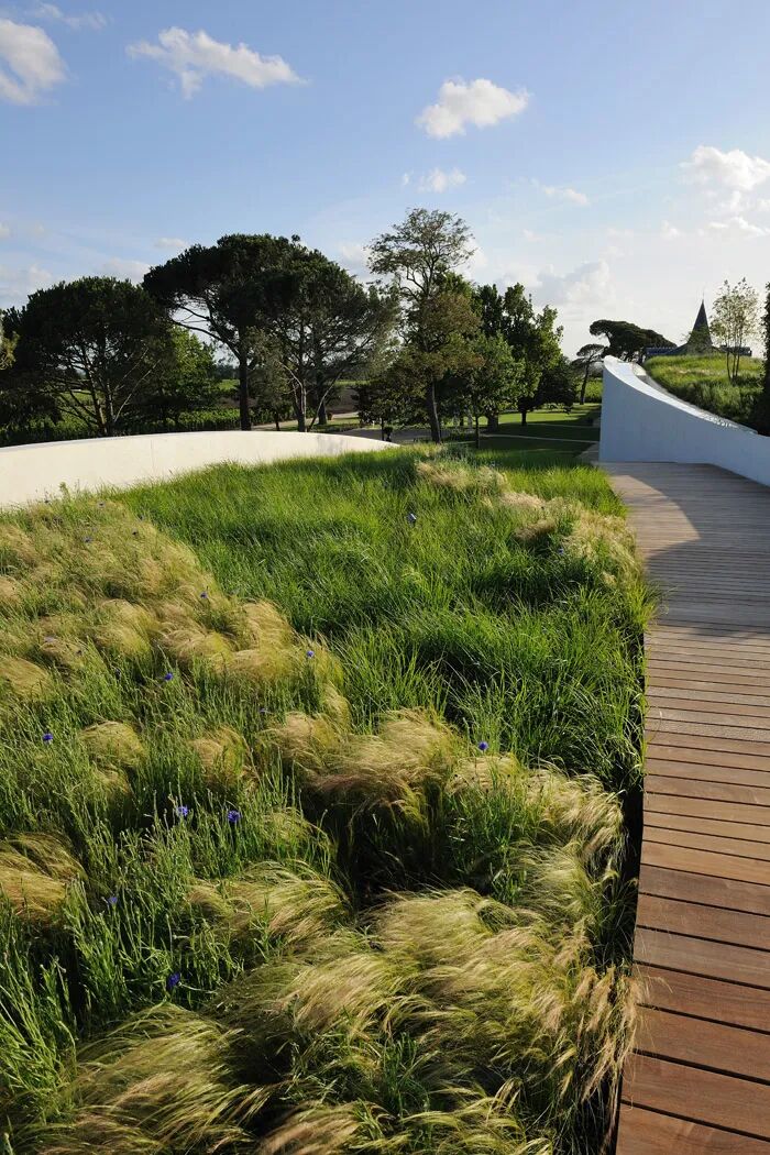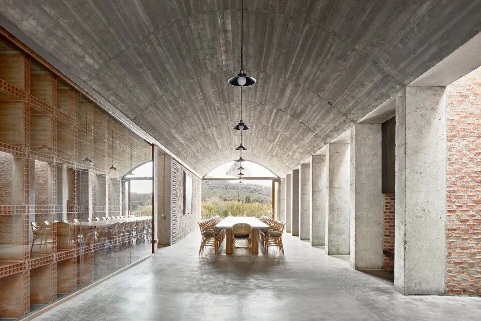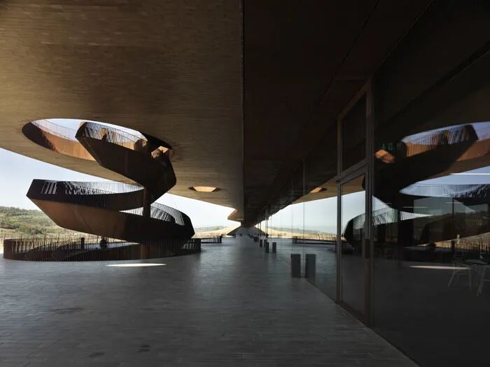 酿酒厂的功能要满足葡萄酒生产过程的需要,并与现有的土地和房屋相协调。建筑位于地下,其空间由经过精密计算的巨大混凝土拱构成,屋顶平台上设有花园,可以对水资源进行储存和再利用。
