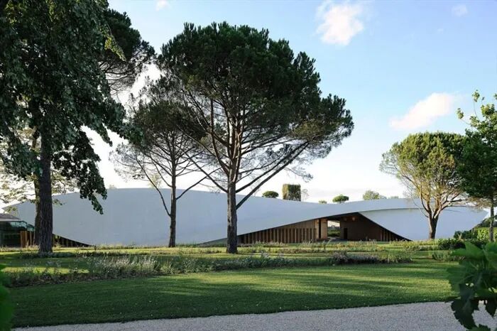 法国波尔多著名酒庄——白马酒庄,是法国波尔多八大酒庄之一,位于波尔多圣埃米利法定产区,新的酒庄建筑宛如脱离地球重力,漂浮在空气中即将向光明的宇宙扬帆出发的混凝土帆。优美的曲面和白色的混凝土静谧的停靠在这里,让人冥想,又诱人前往。