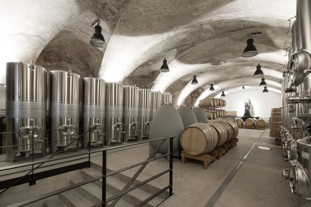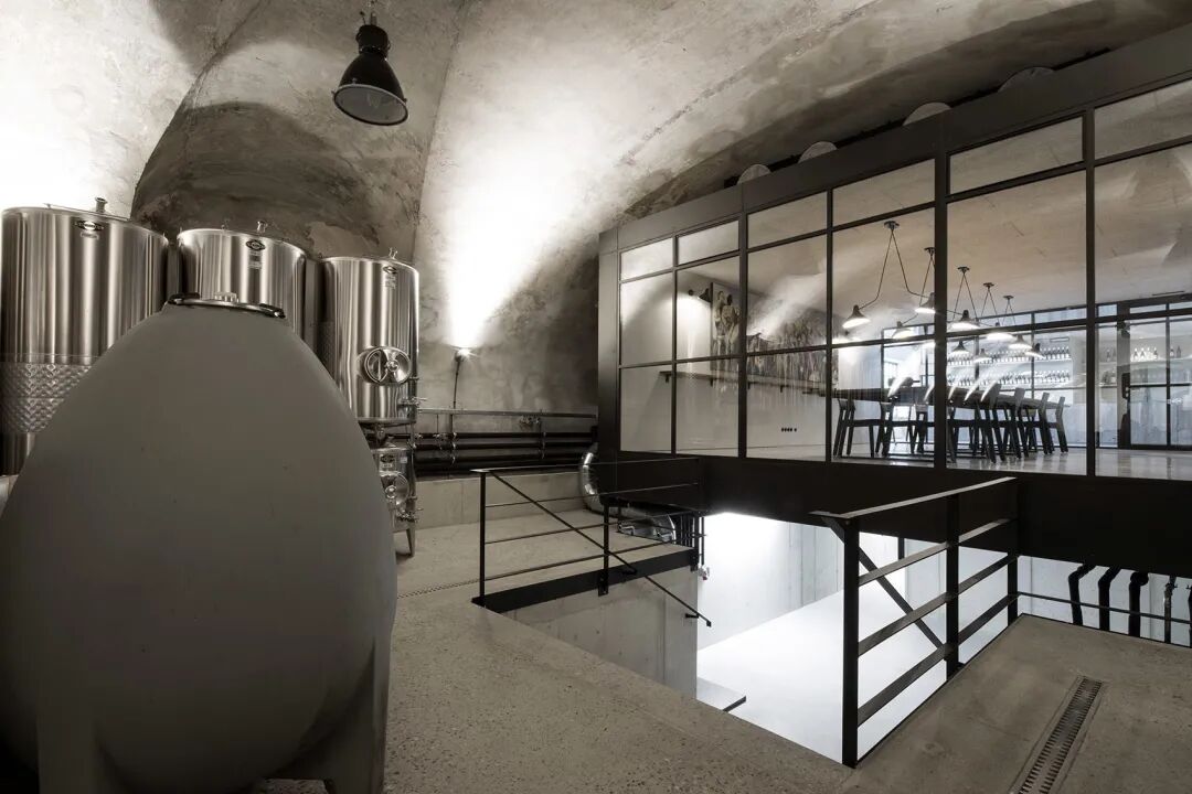 设计师以砖材打造这座酒厂,并精心设计了灯光效果。建筑细节与整体美学都以灰色为主调,突出了酿酒空间的功能。工业元素的使用凸显出酒厂空间的生产功能。纯粹、简单又朴素的建筑外观契合了天然葡萄酒的纯正与优质。