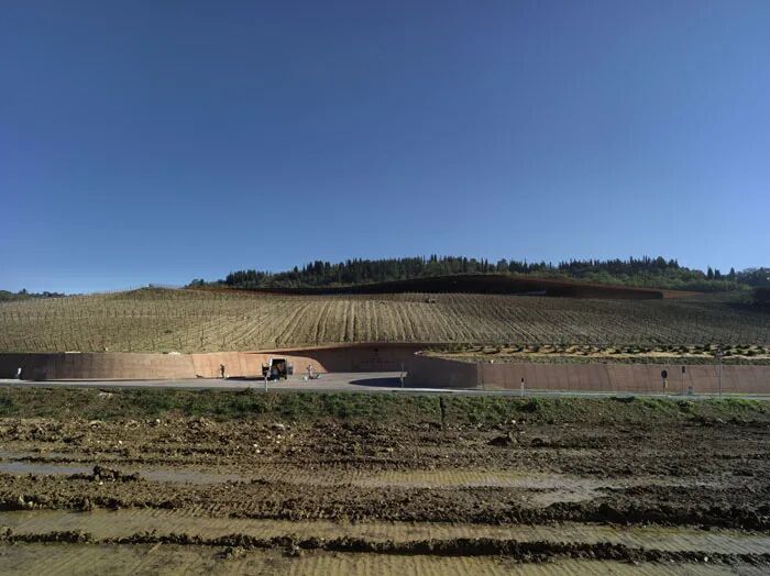 项目基地被基安蒂山脉环绕,大片葡萄园种植基地,建筑设计和周围环境完美融合,将日光引入建筑内部,同时以虚构透视图的方式向屋内呈现观赏风景的角度。立面上沿着自然的坡度向水平方向做出延伸,间隔着一行行的葡萄藤,而这些葡萄藤与土地一起构成了“屋顶覆盖层”。