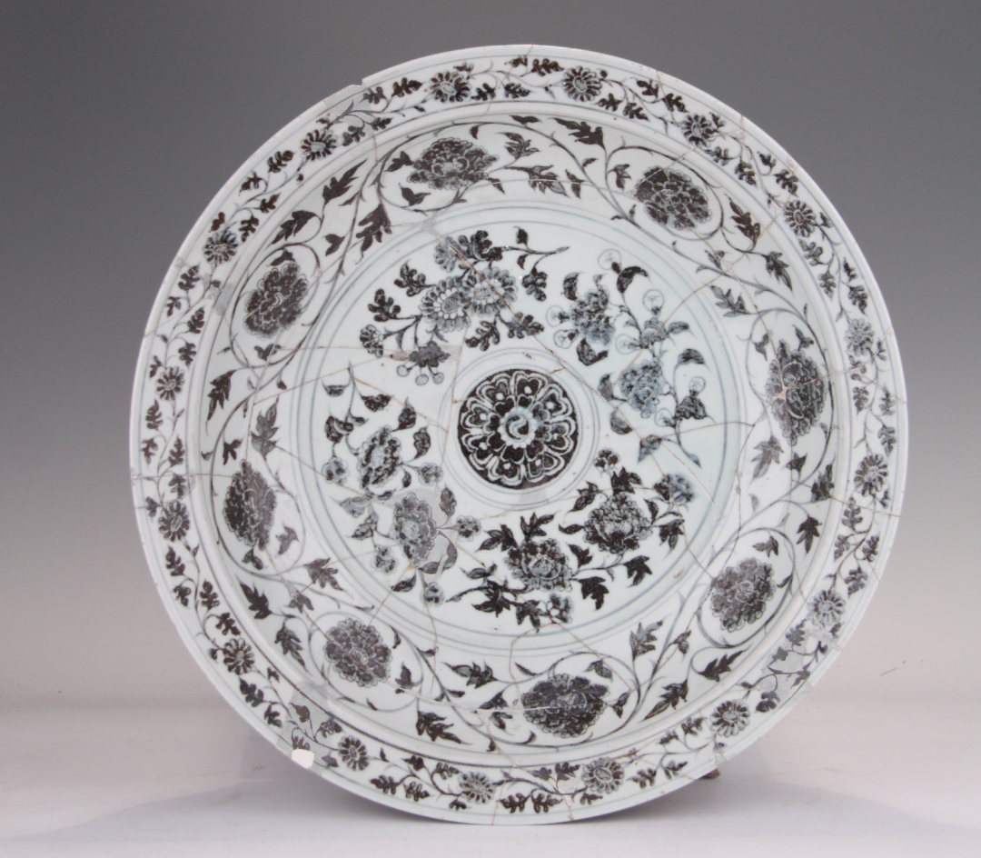 该盘的造型与装饰均明显受元青花的影响。此时纹饰相比元青花构图简单,题材大量减少,以花卉为主,采用多方连续工整花卉作主题装饰纹样为洪武常见。洪武年间规定,登、铏以瓷碗代;簠、簋、笾、豆以瓷盘代。洪武各类大盘、大碗,正是传统礼器的代用品。