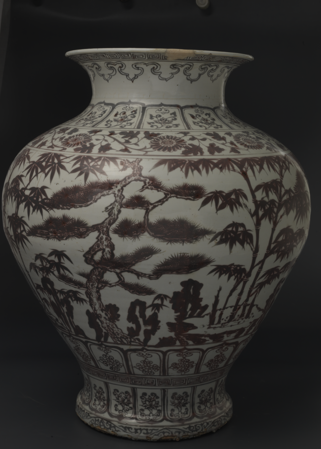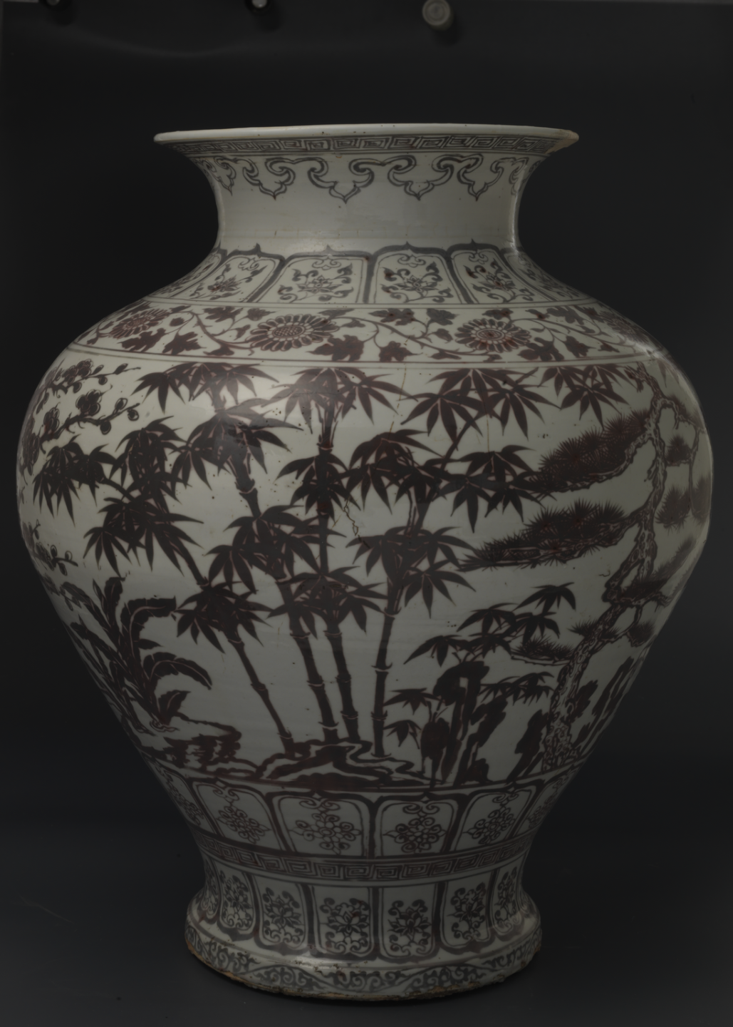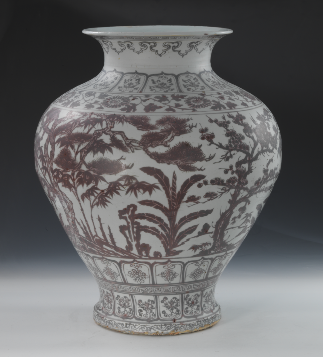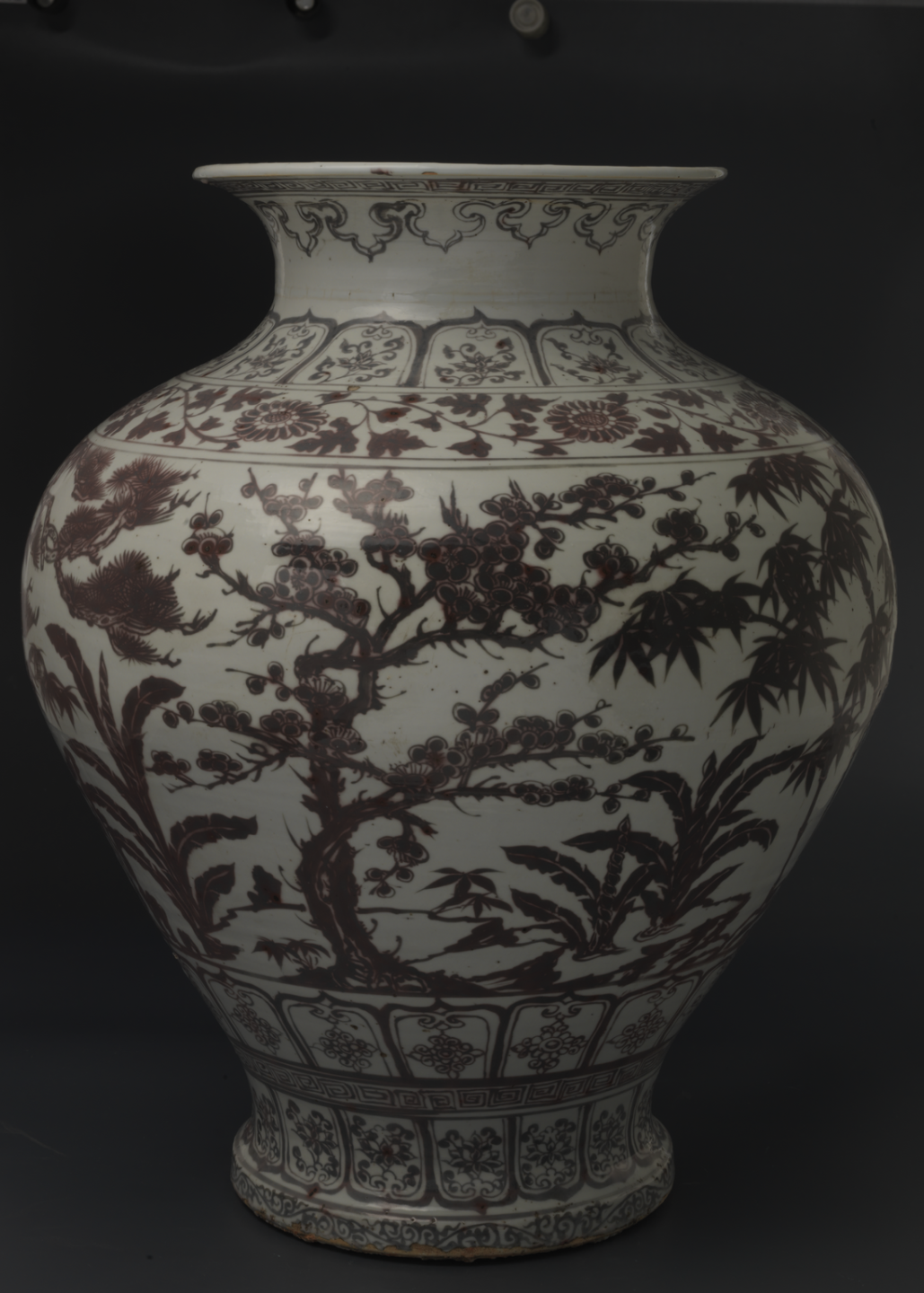 釉里红是洪武时期官窑瓷器最重要的品种之一,或与明太祖朱元璋崇尚红色有关。该罐原配有盖,已失。这类罐有青花、釉里红品种,体量硕大,造型端庄,在宫廷祭祀礼仪中替代传统礼器中的太尊、著尊、牺尊等的功能,属宫廷祭器一类。
